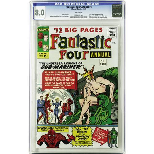 <B>Fantastic Four Annual #1 (Marvel, 1963) CGC VF 8.0 White pages.</B></I> The Sub-Mariner attacks the human race in this great square bound issue. Jack Kirby provides the cover and story art, while an early Spider-Man appearance in a backup feature comes with Steve Ditko inks. The second backup feature reprints the Fantastic Four's origin. But wait -- there's also the first appearance of Krang, and the first Silver Age appearance of Lady Dorma. Whew! Overstreet 2006 VF 8.0 value = $595. CGC census 3/06: 19 in 8.0, 57 higher.