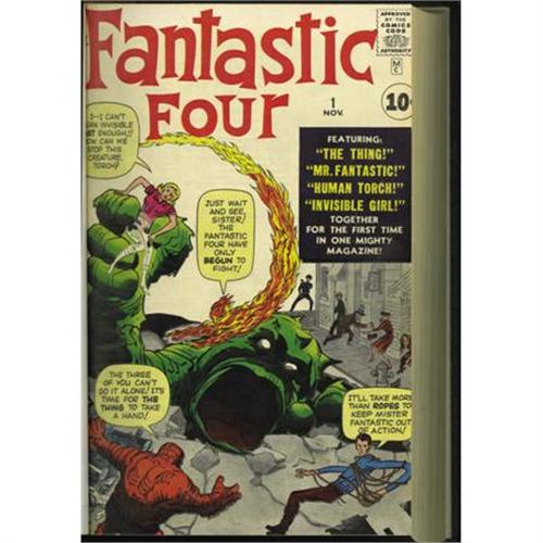 <B>Fantastic Four #1-20 Bound Volume (Marvel, 1961-63).</B></I> The collected earliest adventures of the Fantastic Four, featuring a ton of first appearances. Included are copies of <B>FF </B></I>#1 (origins and first appearances of Mr. Fantastic, Invisible Girl, Human Torch, the Thing, and Mole Man), #2 (vs. the Skrulls), #3 (first appearance of the Fantasti-Car), #4 (first Silver Age appearance of the Sub-Mariner), #5 (origin and first appearance of Dr. Doom), #6 (first Marvel super-villain team-up), 7, #8 (first appearances of Puppet Master and Alicia Masters), 9, 10, #11 (origin and first appearance of Impossible Man), #12 (vs. the Hulk), #13 (first appearance of the Watcher), 14, #15 (first appearance of Mad Thinker), #16 (first Ant-Man crossover), 17, #18 (origin and first appearance of Super-Skrull), #19 (first appearance of Rama-Tut), and #20 (origin and first appearance of Molecule Man) that have been trimmed and bound into a hardcover volume. Covers and art by Jack Kirby. The books are in excellent condition with mild wear, and many have white pages. Overstreet 2007 VG 4.0 value for group = $7,036.<BR><BR><b>Shipping:</b> Books & Catalogs (<a target="_blank" href="http://www.heritageauctions.com/common/shipping.php">view shipping information</a>)