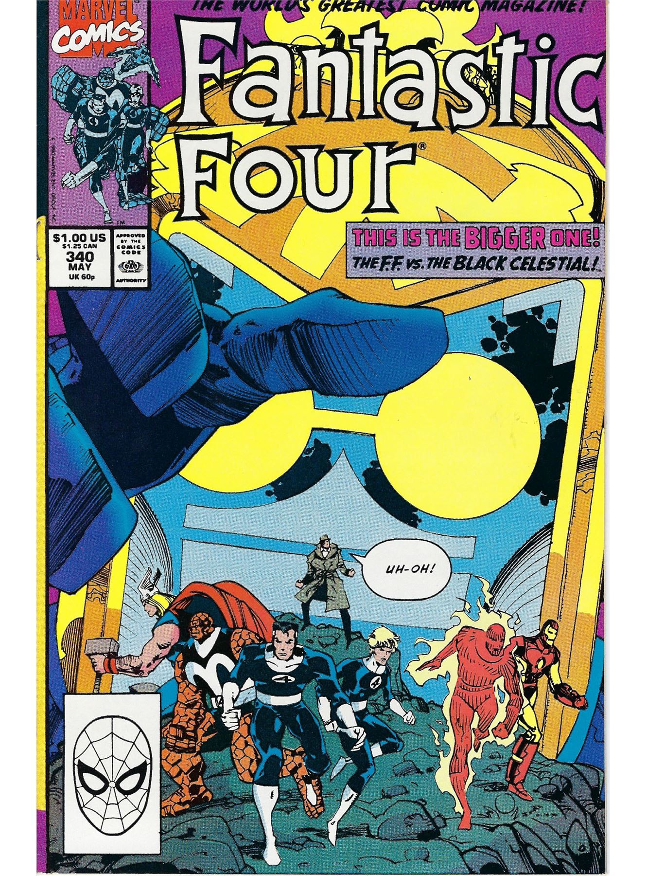 Fantastic Four #340, 1990, Iron Man and Thor guest star in "Double Trouble" Part 4 of 5. Story and Art by Walter Simonson. Cover by Walter Simonson. The Black Celestial enters the time bubble and joins the confrontation between the Fantastic Four and Galactus! But who is the celestial going to help? It's a cataclysmic showdown! Meanwhile, what villain is secretly manipulating the Human Torch behind the scenes?