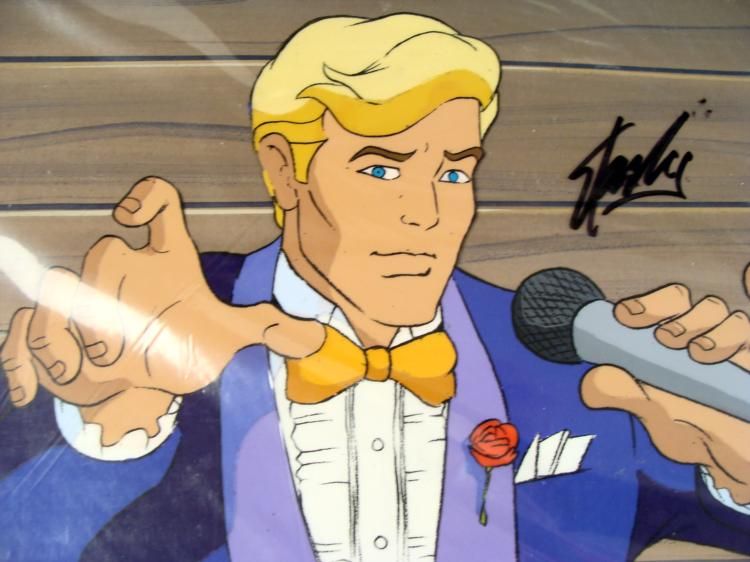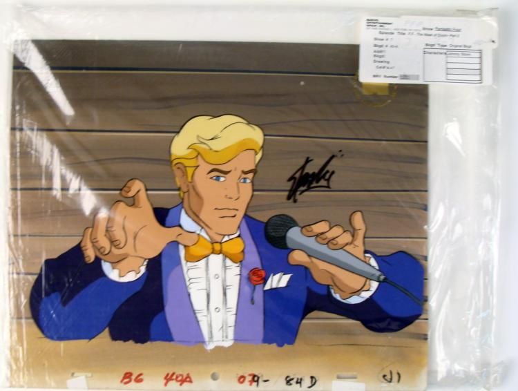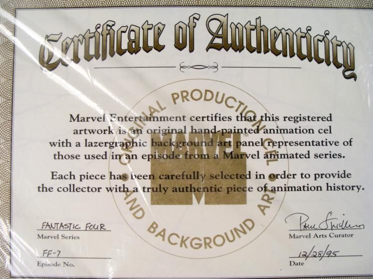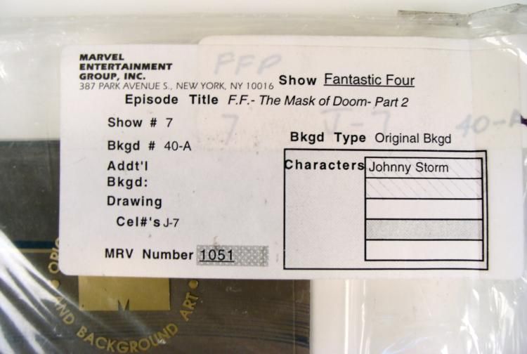 This is an original signed production cel and background are from the hit series Fantastic Four. Stan Lee signature is located on the top right of cel in black sharpie. * * * * The four individuals traditionally associated with the Fantastic Four, who gained superpowers after exposure to cosmic rays during a scientific mission to outer space, are: Mr. Fantastic (Reed Richards), a scientific genius and the leader * of the group, who can stretch his body into incredible lengths and shapes; the Invisible Woman (Susan "Sue" Storm), who became Reed's wife, who can render herself invisible and later project powerful force fields; the Human Torch (Johnny Storm), Sue's younger * brother, who can generate flames, surround himself with them and fly; and the monstrous Thing (Ben Grimm), their grumpy but benevolent friend, a former college football star and Reed's college roommate as well as a good pilot, who possesses superhuman strength * and endurance due to the nature of his stone-like flesh. * * * * Welcome, welcome to my show... My name is Johnny Storm and I will be your host for the next half hour... * * * Original Production Background and Animated Cel * Overall Size of Background: 10 1/2" x 12 1/2" * Overall Size of the Cels: 10 1/2" x 12 1/2" Excellent Condition * * Authenticity: Included * * * This is an original hand-painted cel set-up used in the production of an episode of "The Mask of Doom- Part 2." Each one-of-a-kind set-up represents a slight change in position of the characters. When individually photographed and projected in rapid succession, * the images appear to move. * * To create production cels, the original animator's drawing is transferred onto an acetate cel (by hand-inking and/or photo copying). The cel is then hand-painted on the reverse side. The background accompanying this set-up is a hand-painted original production * background. * * The background and cel are ready to be matted and framed. It is a colored background with a cel and has the animator's notations at the bottom of the background and cel. There is a Marvel seal at the top right corner of the cel and there is a drawing of * inside some home or building, covered in stone on the back of the background. * * * * *