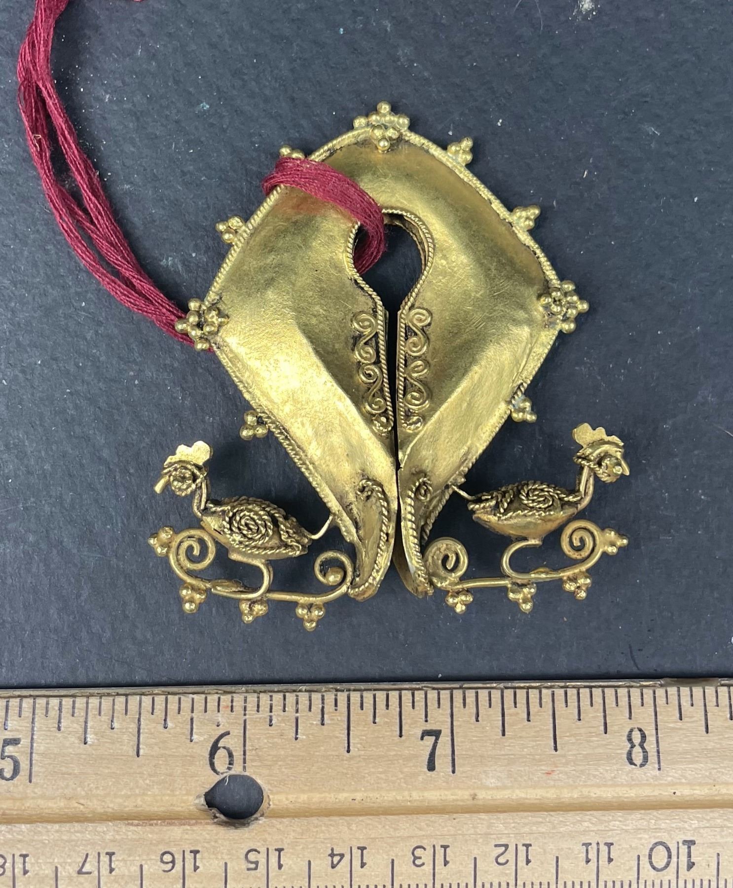 Description: A mamuli in 12 karat gold (33 g), edged in ropework and enhanced with granulation, with cocks addorsed on feet, which are also enhanced with granulation. Original scarlet ribbon present. Perfect new condition. See Opitz, pp. 207-09.