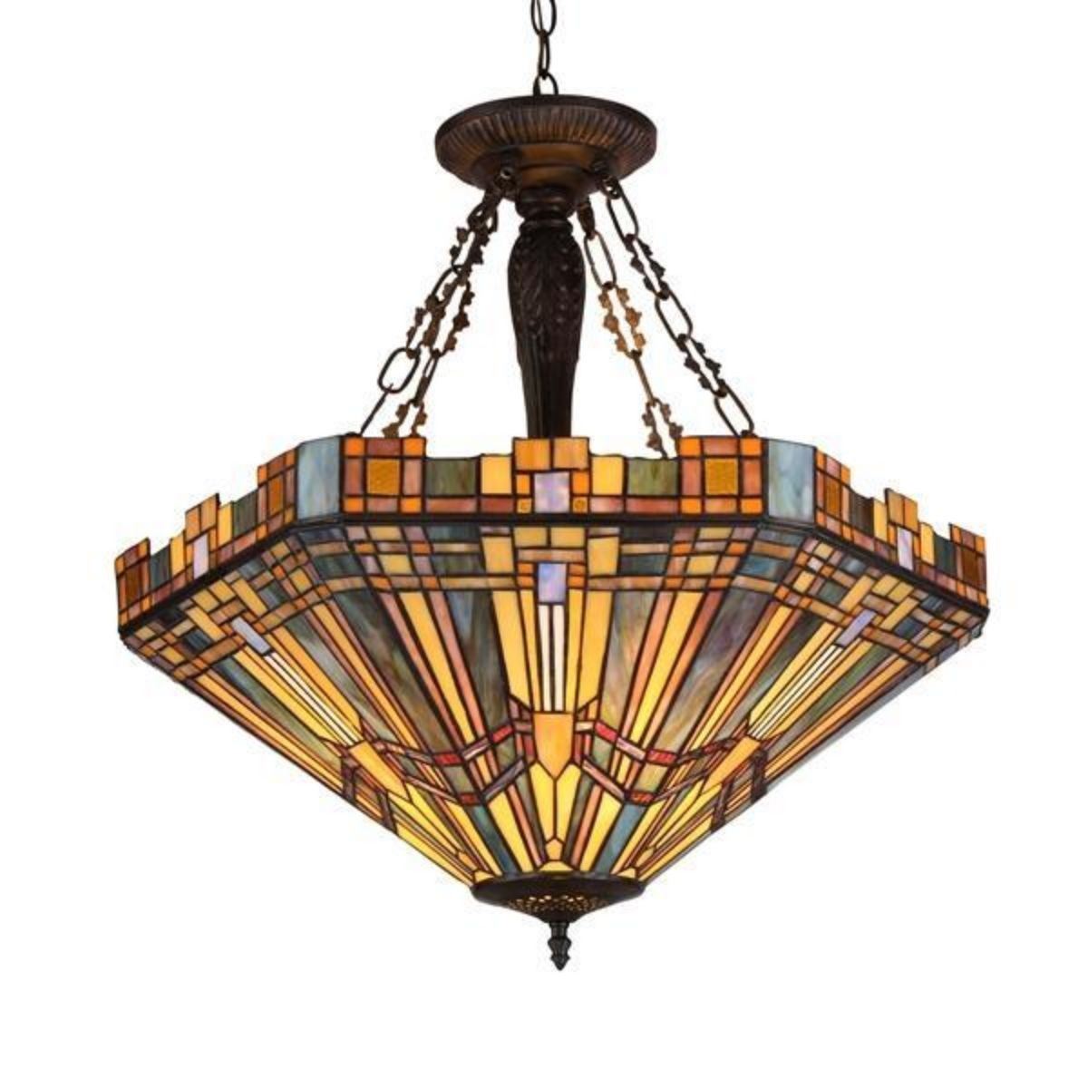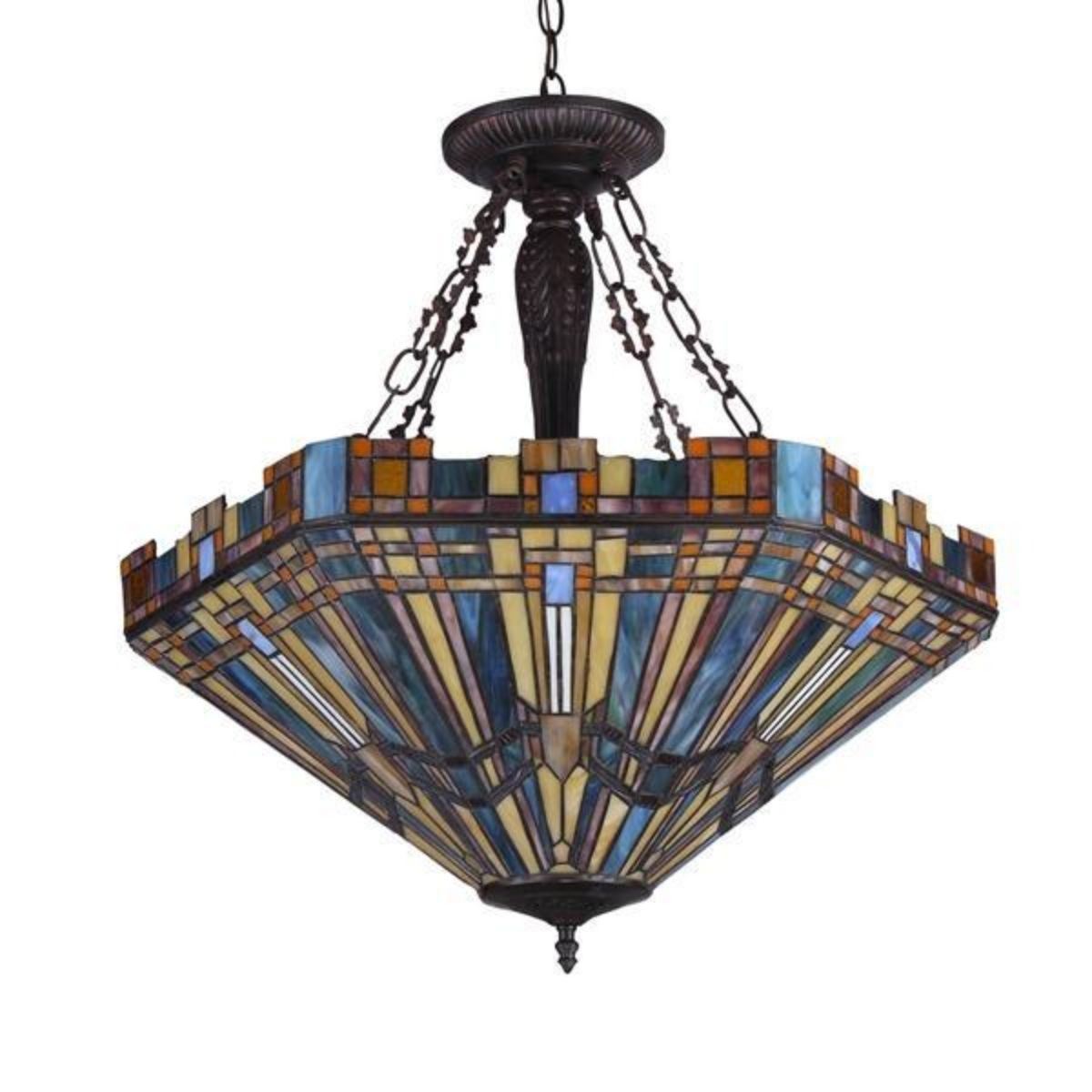 Fantastic Mission-style stained art glass inverted ceiling pendant light, hand-crafted using over 800 pieces of stained art glass, wrapped in copper foil with a dark antique bronze finish. 25" H X 23" W.