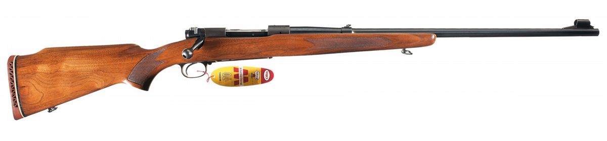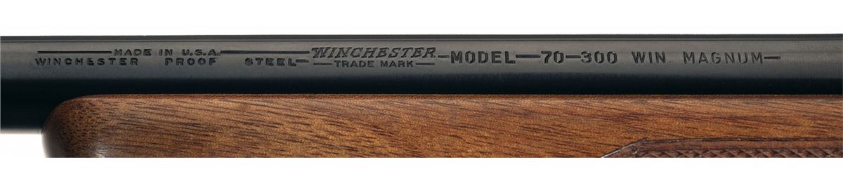 Manufactured in 1963 in the scarce .300 Winchester Magnum caliber. Standard markings including the factory proof on the barrel and receiver at the breech. The bolt is numbered to the gun and has a hollow bolt knob. Receiver is tapped for sight/scope mounting and has a straight tang and late type safety. Equipped with hooded ramp blade front sight and adjustable folding leaf rear sight. Mounted on a checkered high comb pistol grip stock with sling swivels and a vented factory recoil pad.