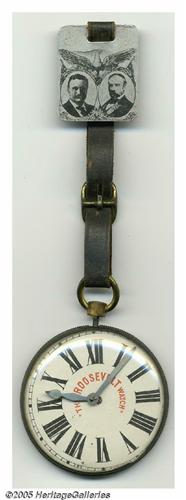 <B>Fantastic Teddy Roosevelt Toy Pocket Watch, with Roosevelt - Fairbanks Jugate Campaign Fob</B></I> Another great item we have never seen before! The toy watch (not made to function as an actual watch) is a large 2 1/8" size and made of tin shell. The hands do move, controlled by the nob at the top. The face proclaims "The Roosevelt Watch." The attached, double-sided fob is aluminum, made similarly to the familiar aluminum pin trays. We have not seen the fob, either, and it clearly appears to have been sold with the watch. Minor imperfections, but overall excellent condition. One of the very neatest small TR 3-D items we have ever encountered! Lot:261