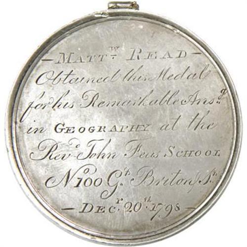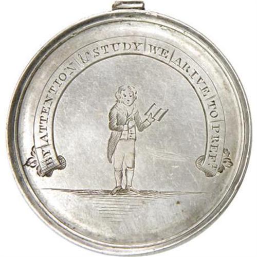 <B>1798 Fantastic, Completely Hand-Engraved British School Award Medal.</B></I> Silver, 59.5 mm, 16.2 gm.<B> </B></I>1798 engraved presentation school award. This outstanding item has on the obverse a young boy in the center holding a book in his left hand with the caption above in the form of a horseshoe "BY ATTENTION &<B> </B></I>STUDY WE ARRIVE TO PREFt. Reverse neatly engraved: MATTw. READ OBTAINED THIS MEDAL FOR HIS REMARKABLE ANSr. IN GEOGRAPHY AT THE REV JOHN fECS SCHOOL N100 G BRITON ST. DECr. 20th 1798. We have seen very little over the years of this kind of school award. A remarkable item.<BR><BR><b>Shipping:</b> Coins & Currency (<a target="_blank" href="http://www.heritageauctions.com/common/shipping.php">view shipping information</a>)