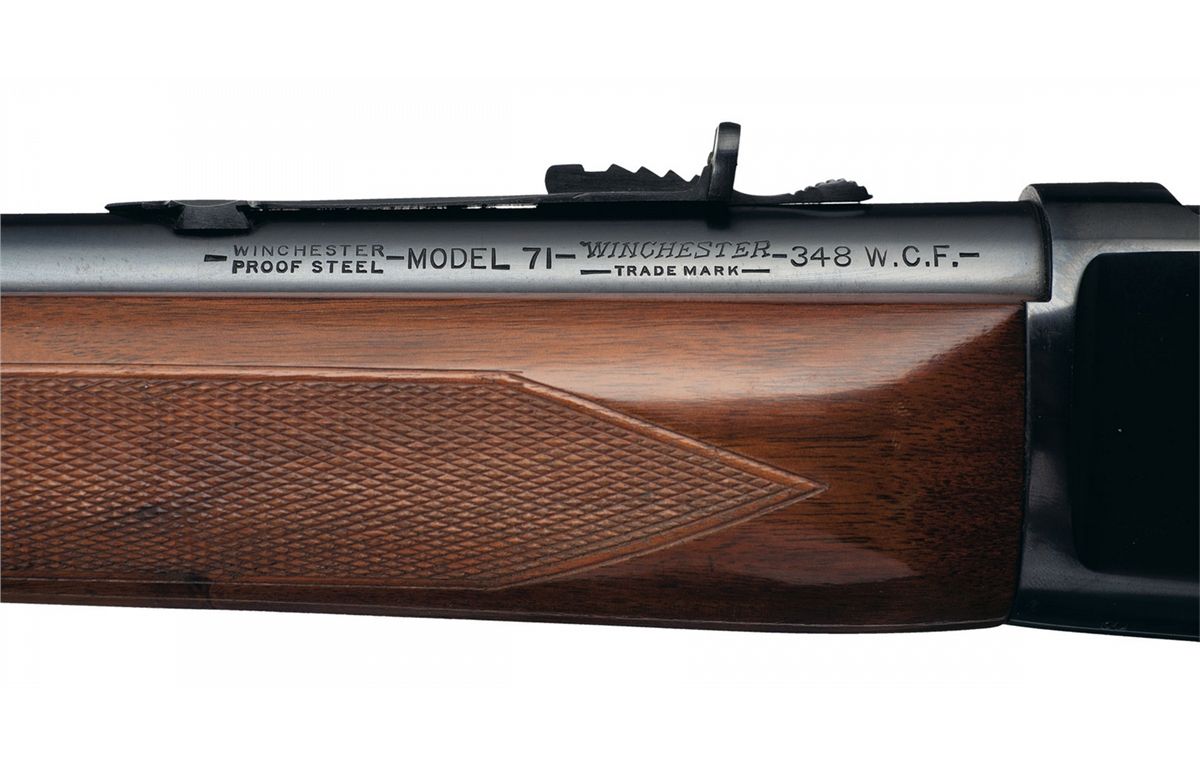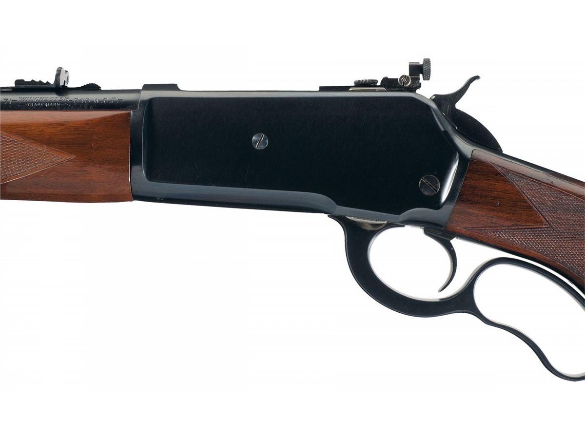 Manufactured in 1941 with a hooded ramp front sight with stippled ramp, an elevation adjustable semi-buckhorn rear sight and a bolt mounted adjustable peep rear sight. This example has the short tang with the first style barrel markings. Mounted on a diamond pattern checkered walnut semi-beavertail forearm and pistol grip stock with hard rubber grip cap, sling swivels and a checkered steel buttplate.