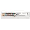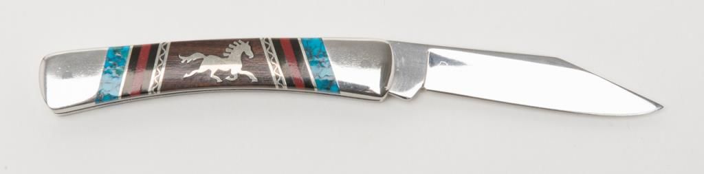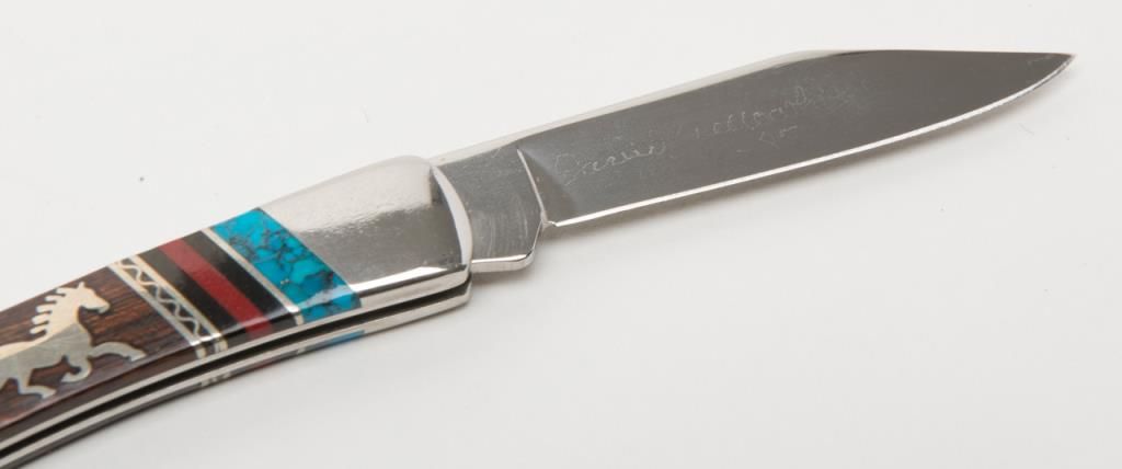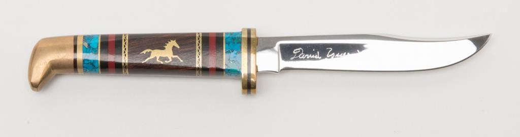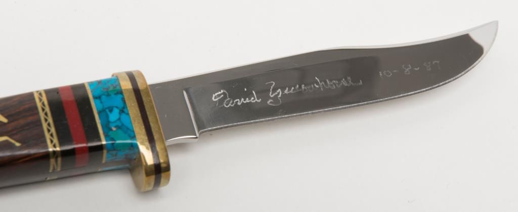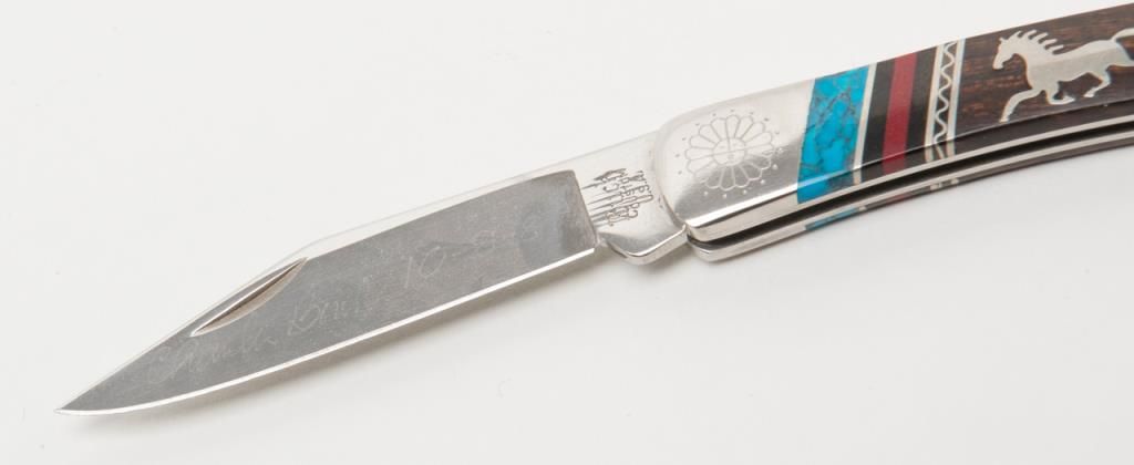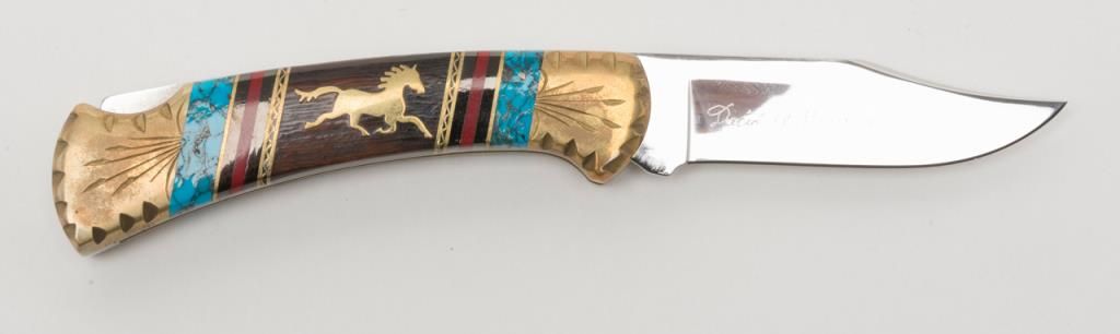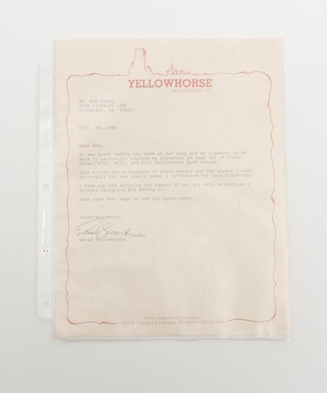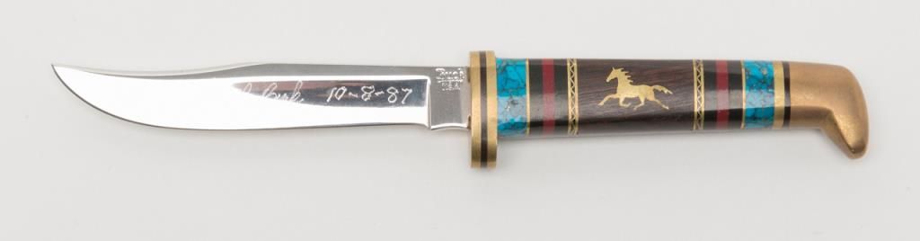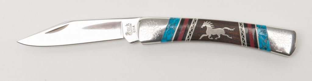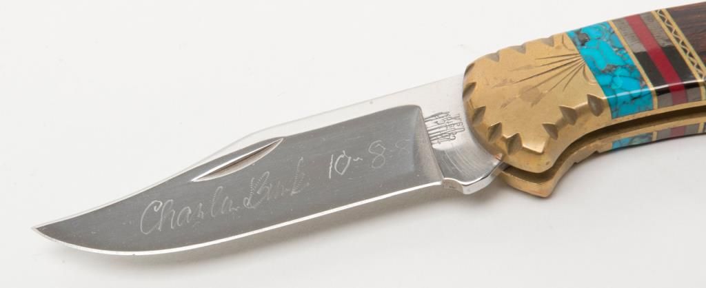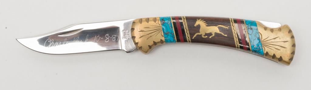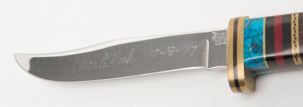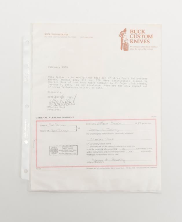 Fantastic and possibly unique set of 3 custom buck knives signed by "Chuck" Buck, President of Buck Knives and David Yellow Horse, Native America artist of Indian jewelry. Presentation case with display plaque;1989 authenticating letters fromMr. Buck and Yellow Horse. Est.: $750-$1500.