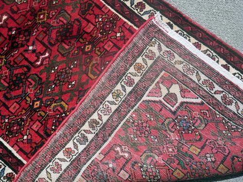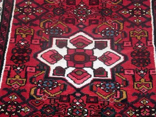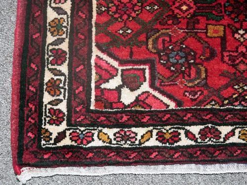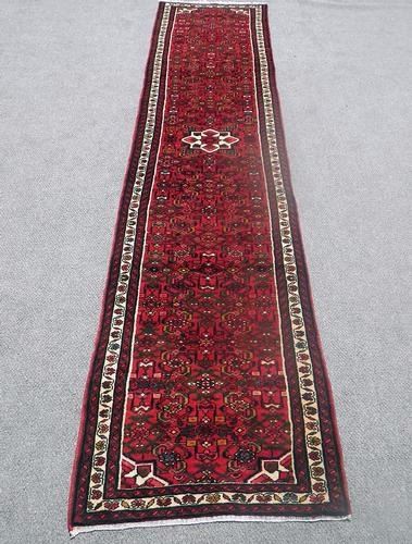 Stunning Persian Hossein-Abad Runner. Made of fine quality baby lamb's wool pile on cotton foundation, all natural vegetable dye, unique Persian Runner from Hamadan Hossein-Abad Rug red floral design, crowned corners. Hossein-Abad located in the southern part of hamadan province, not too far from malayer and nahavand. This area is surrounded by many towns and villages that weave their own Rugs. The wool and sometimes the Rugs themselves are attributed to the Saveh Shah Savan. Hossein-Abad produces a variety of different Size. Rugs including top-notch Runners. the Rugs are made with single weft construction and wear well due to sturdy construction. Size: 2 feet 10 inches X 14 feet 4 inches. Hand woven in Hossein-Abad from Iran.