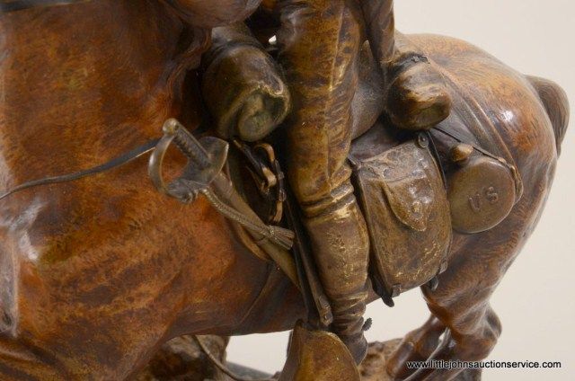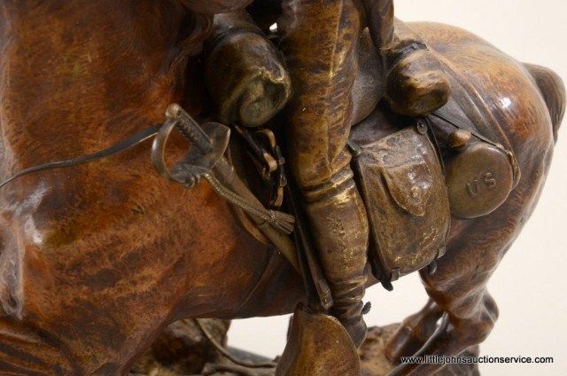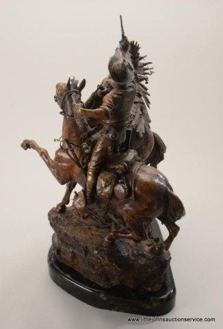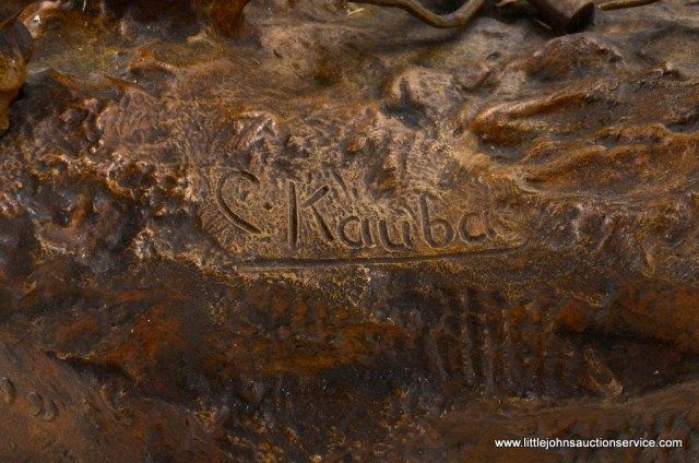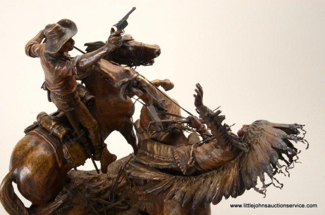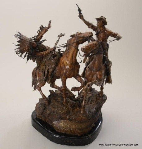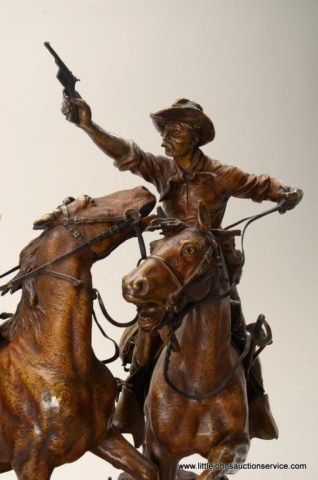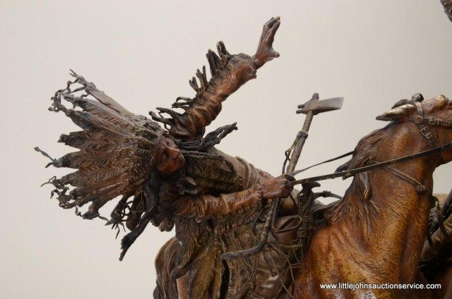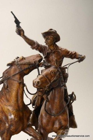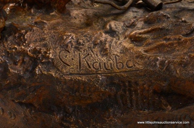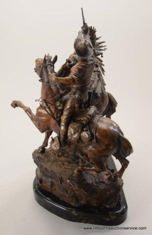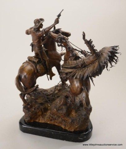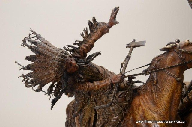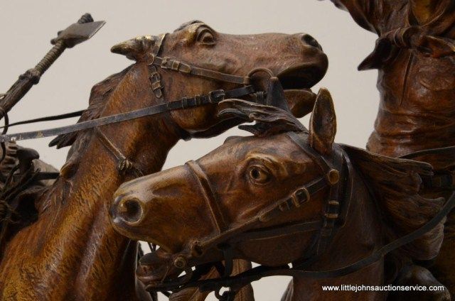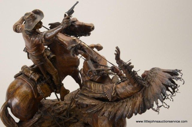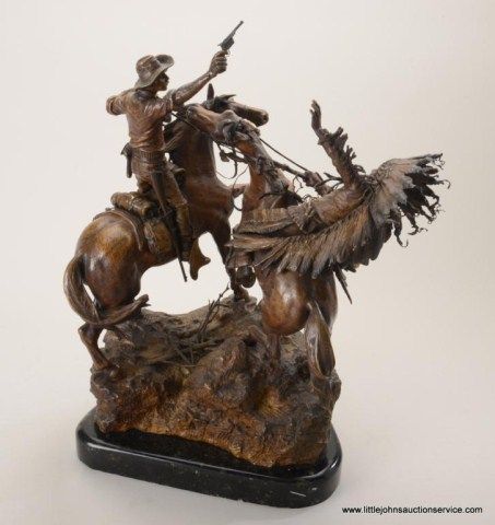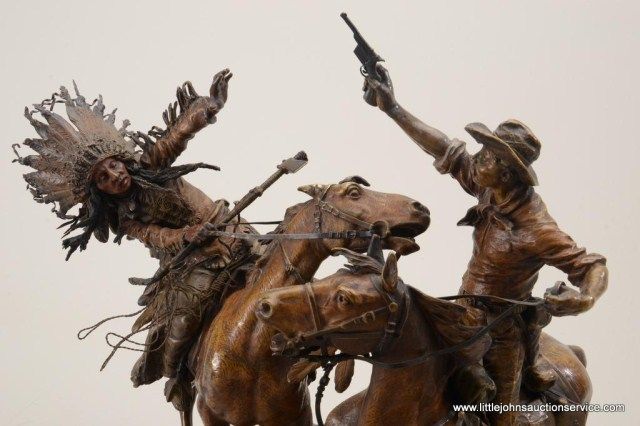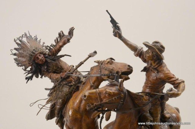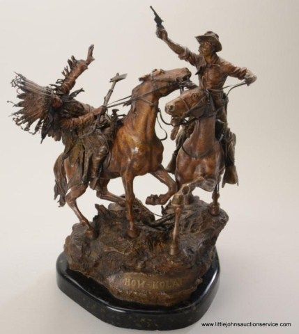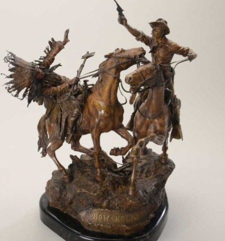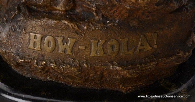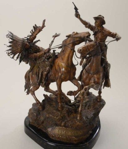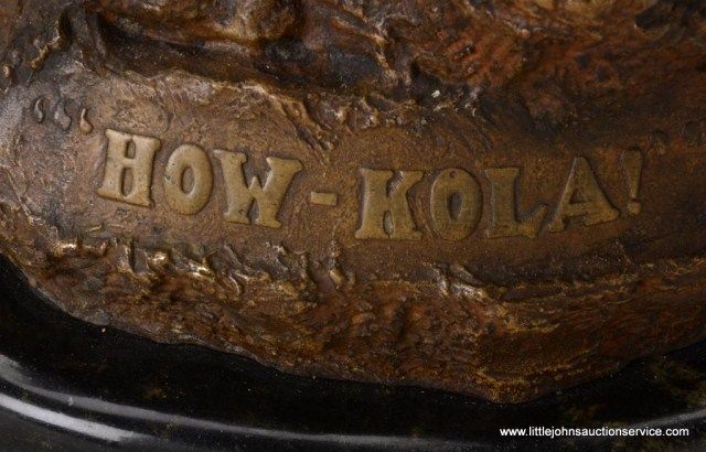 Fantastic original bronze signed “Kauba” and entitled “How Kola” showing great action and fine detail. The subject portrays a cowboy and an Indian colliding and fighting from horseback. The bronze measures 27” in height by 16” in width by 21” across. In fine condition with great patina and needing cleaning of dirt. Consigned from Premier Alaskan Gallery. Est.;$6,000.-$12,000.