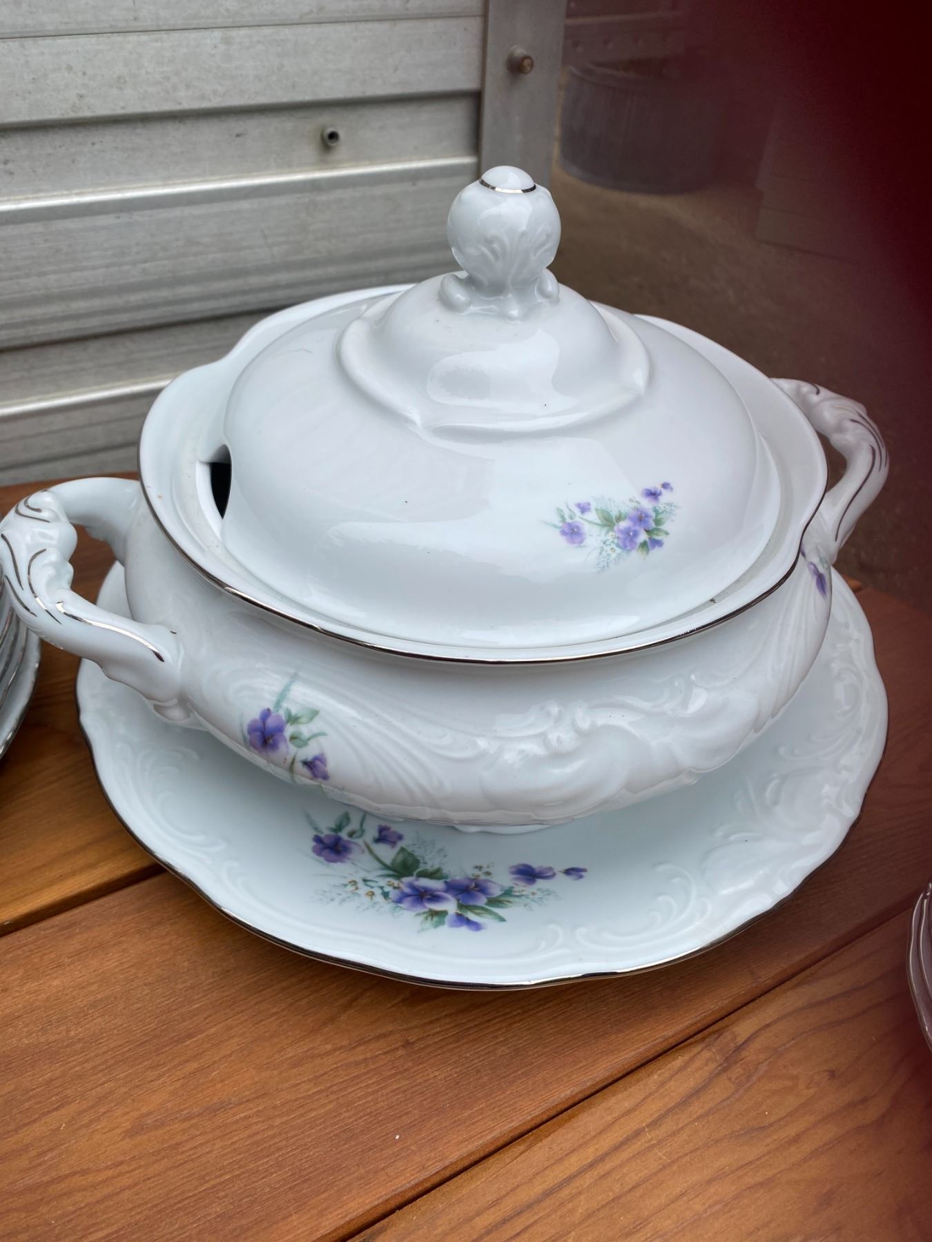 Fantastic set of Polish fine China in hard to find purple violets pattern. Serving for 8, 50 pieces in total, perfect condition