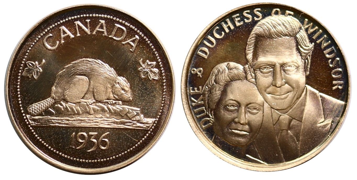 Fantasy Gold coin from Richard Lobel series struck circa 1984, Duke and Duchess of Windsor, Edward VIII, Canada dated 1936. The reverse is the iconic design of the modern Canadian 5 cent piece. Gold (9k), only 200 minted, 4.85g.