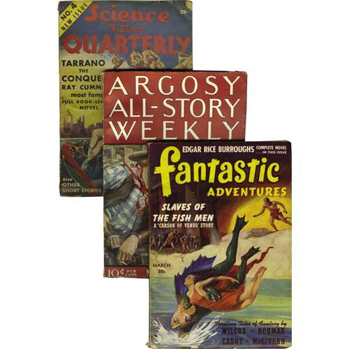 <B>Fantasy Magazine fanzine and Miscellaneous Pulp Group (Various, 1924-41).</B></I> This lot consists of <B>Science Wonder Quarterly</B></I> Spring 1930 (VG/FN); <B>Fantastic Adventures</B></I> March 1941 (Edgar Rice Burroughs cover story - FN); <B>Argosy All-Story Weekly</B></I> March 8, 1924 (Burroughs Tarzan serial - FN); <B>Science Fiction Quarterly</B></I> (first series) Summer 1941 (#4 - VG), Winter 1941-42 (#5 - GD+), Spring 1943 (#10 - GD/VG); <B>Super Science Stories</B></I> September 1940 (VG); and <B>Future Fiction</B></I> April 1941 (GD). Also included are the following items from the collection of pulp authors Helen and Stanley Weinbaum: An original mailing envelope from <B>Fantasy Magazine</B></I> to "Mrs. Helen Kasson"; and three issues of the classic science fiction fanzine <B>Fantasy Magazine</B></I>, edited by Julius Schwartz, Forrest Ackerman, and Ray Palmer. Included are the issues dated June 1935 (writings by Ray Cummings, Stanley Weinbaum, and more - VG), September 1935 (writings by Stanley Weinbaum, Donald Wandrei, Edward E. Smith, H. P. Lovecraft, Robert E. Howard, and more - VG), and September 1936 (writings by H. G. Wells, Stanley Weinbaum, Eando Binder, and "in memoriam" to Robert E. Howard - VG). Helen Kasson was the sister of Stanley Weinbaum, she also wrote science fiction under the name Helen Weinbaum. Julius Schwartz's <B>Fantasy Magazine</B></I> fanzines are not listed in the price guide, but are rare and desirable. For the pulps, Bookery's Guide to the Pulps approximate value for group = $280. <BR><BR><B>Important notice:</B> Heritage usually auctions material at the rate of 200-250 lots per hour. On some occasions eBay Live bid software or the Internet may not be able to keep up with the pace of the auction. We recommend placing a realistic absentee bid now as insurance to avoid disappointment. Occasionally the auctioneer may eliminate or reject an eBay Live bid, and the auctioneer may also reopen a lot after the close of the eBay live bidding (usually because we missed an audience bid), and may reject your bid even if it shows you as the winning bidder. By bidding via eBay Live, you agree that Heritage may award the lot to another bidder at its sole discretion under the circumstances described above or any other reasonable circumstances. Since eBay bids are not shown to us until we open the lot on the floor, we treat those bids just like floor bids. In most cases the floor responds before the eBay bid is presented to us, due to Internet lag time, so for consistency we have made it a policy that floor bids are always considered first over tie eBay live bids. Also please note that all Heritage lots purchased through eBay Live carry a 22.5% Buyer's Premium. Please make sure you read the Terms and Conditions before you bid. This lot is being auctioned in conjunction with a live floor auction by Heritage Auction Galleries. All final auction and invoice information will be supplied by Heritage Auction Galleries, and all other information should be considered preliminary. Lot:41001 <BR><BR><B>Winning Notification and Billing:</B> After the FINAL session in this auction is complete, Heritage will send e-mail and snail mail invoices. This process normally takes several days. All final auction and invoice information will be supplied by Heritage Auction Galleries, and all other information should be considered preliminary. <BR><BR>This auction will be conducted on a live auction floor and over the Internet through eBay Live. If you choose to place an absentee bid, please take a moment to <font color='#0000ff'><u><a href='http://pages.ebay.com/liveauctions/help/before/laabsentee.html'>learn how eBay Live absentee bidding works</a></u></font><font color='#000000'>