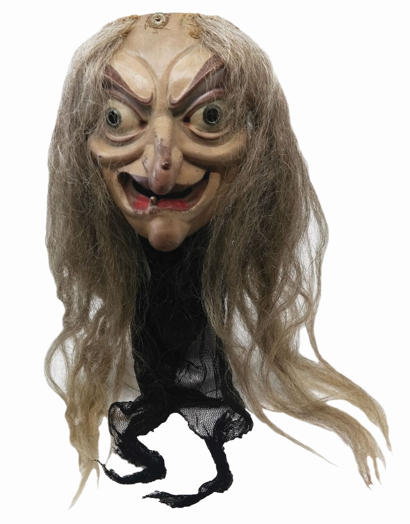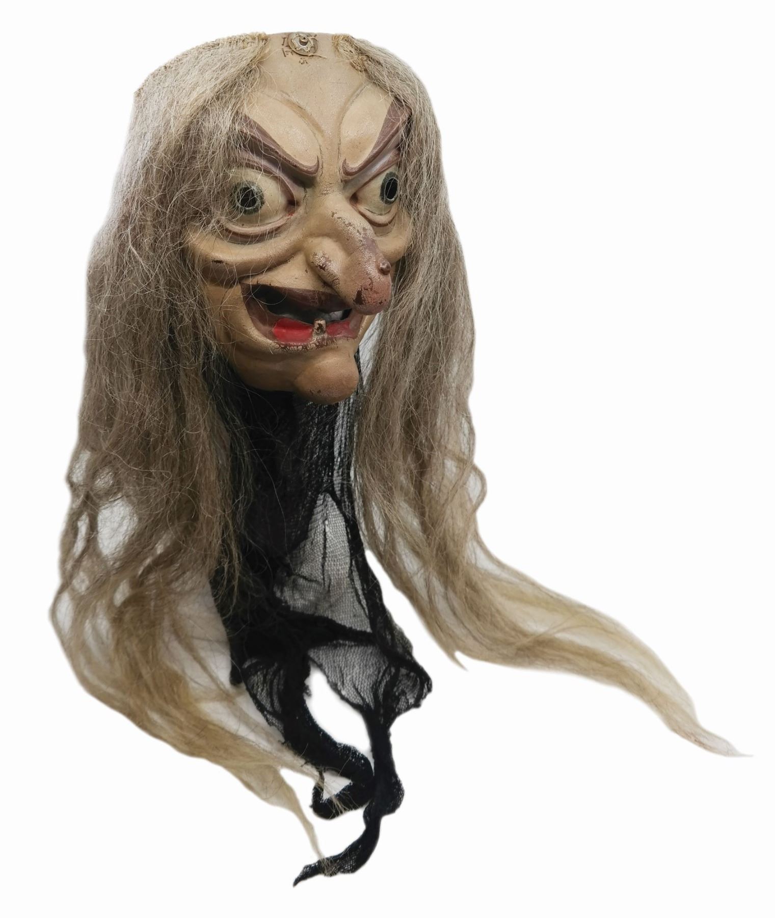 (Disneyland, c.1960s) A hand-painted mask of the Old Hag from Snow White and the Seven Dwarfs, used in Disneyland's Fantasy on Parade. This mask is slightly smaller than those used for walk-around appearances of the character, as the routines in Fantasy on Parade required performers to have a better range of vision. Composed of hand-painted latex rubber and horsehair, the mask measures approximately 7.5" tall, not including the hair, and is in fair to good condition. The elastic and ribbon straps are still attached, but have loosened over time. There is some chipping to the paint throughout, particularly around the nose and mouth, however the mask still presents itself very well.