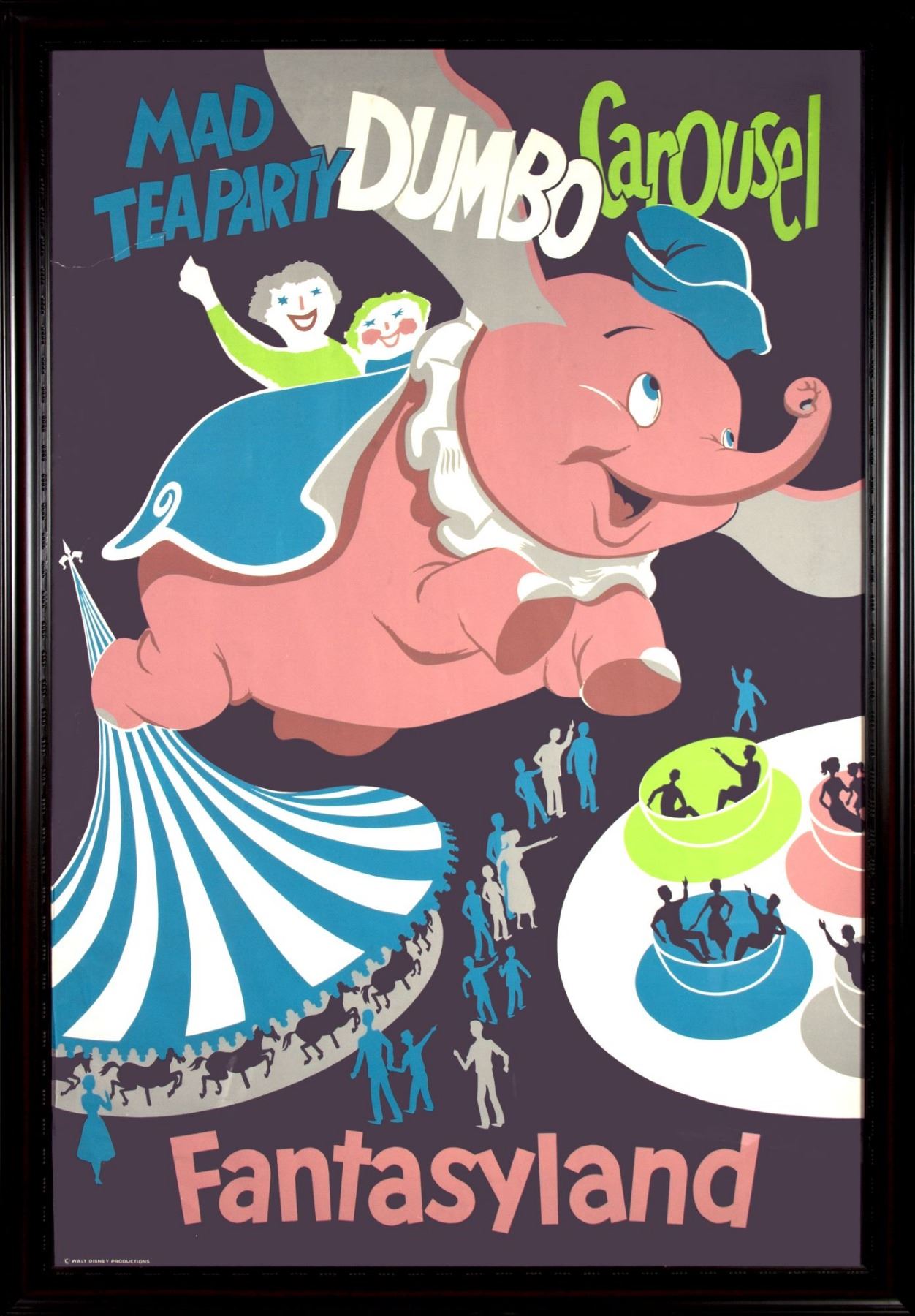 (Disneyland, 1955) An original hand-silkscreened poster for Disneyland's "Fantasyland". This Bjorn Aronson designed poster features the "Mad Tea Party", "Dumbo", and "King Arthur Carrousel" attractions. The poster measures 54"x36" and is in fair to good condition with some wear throughout, including along the edges and a 5.5" tear in the top-left corner that has been repaired on the back side with tape.