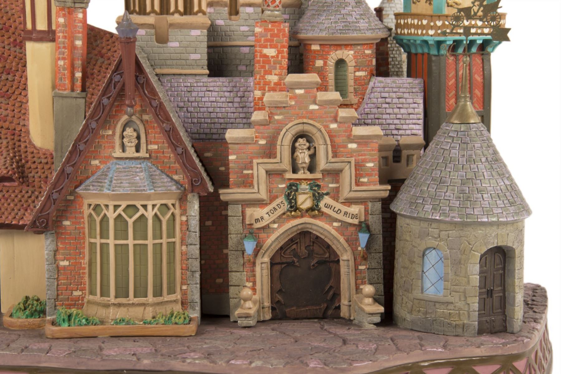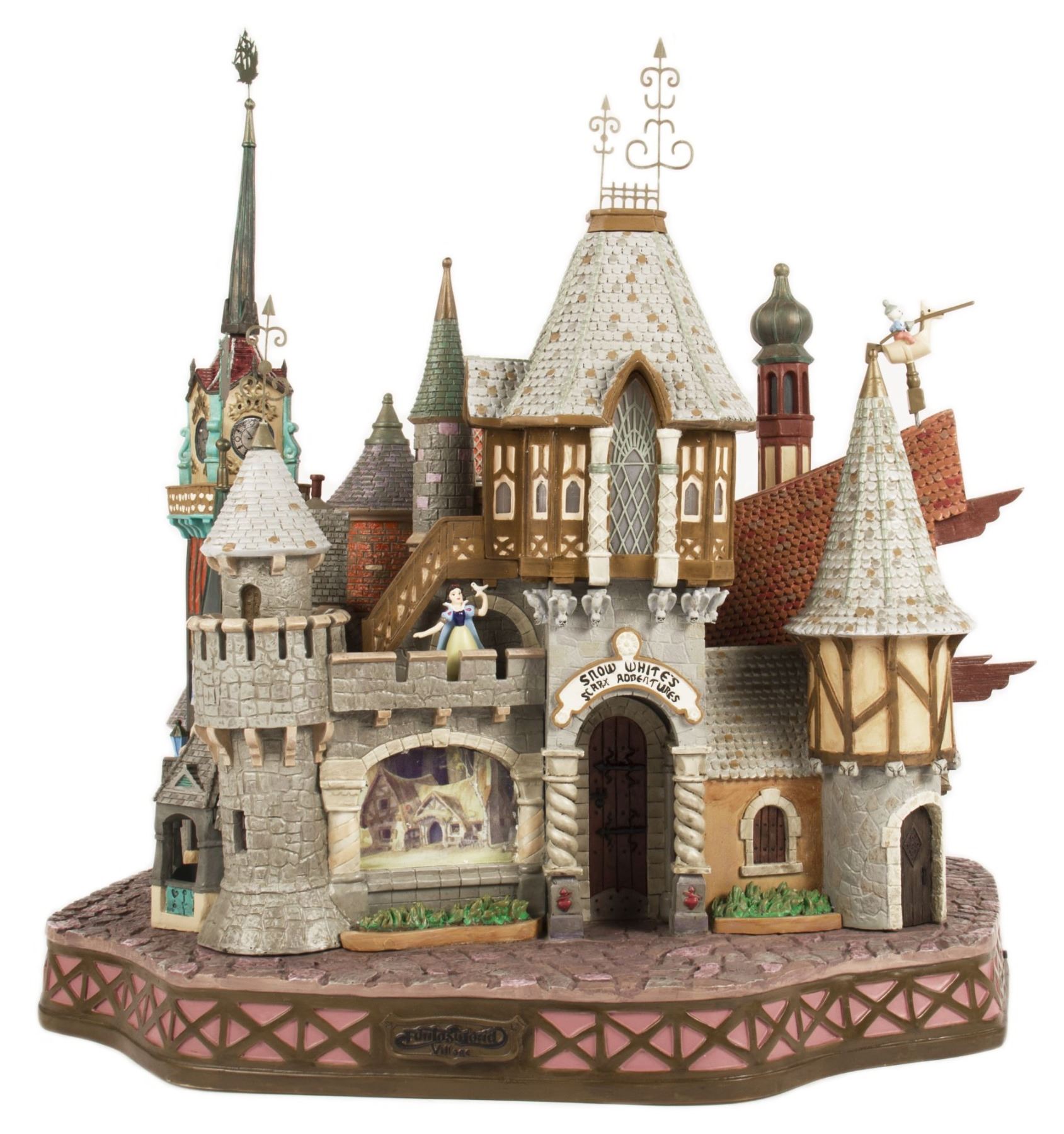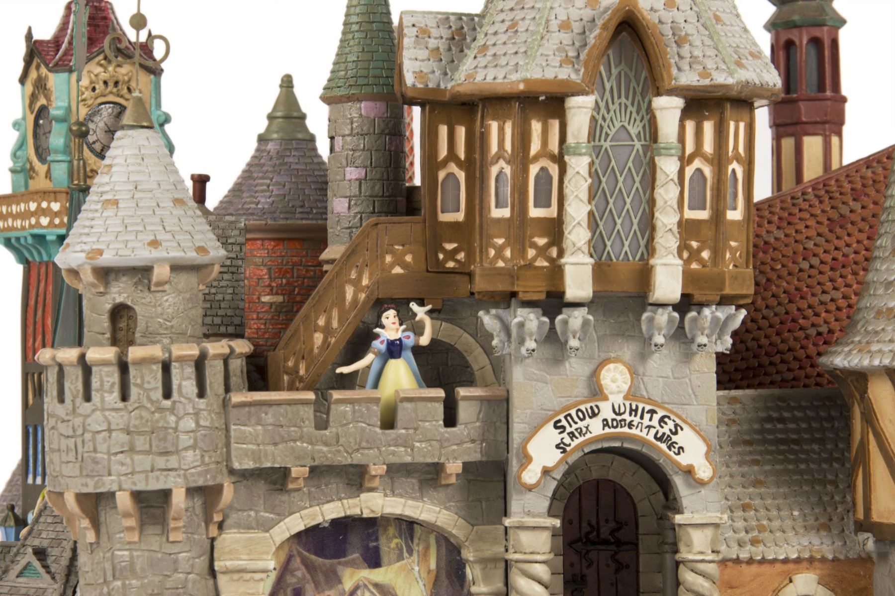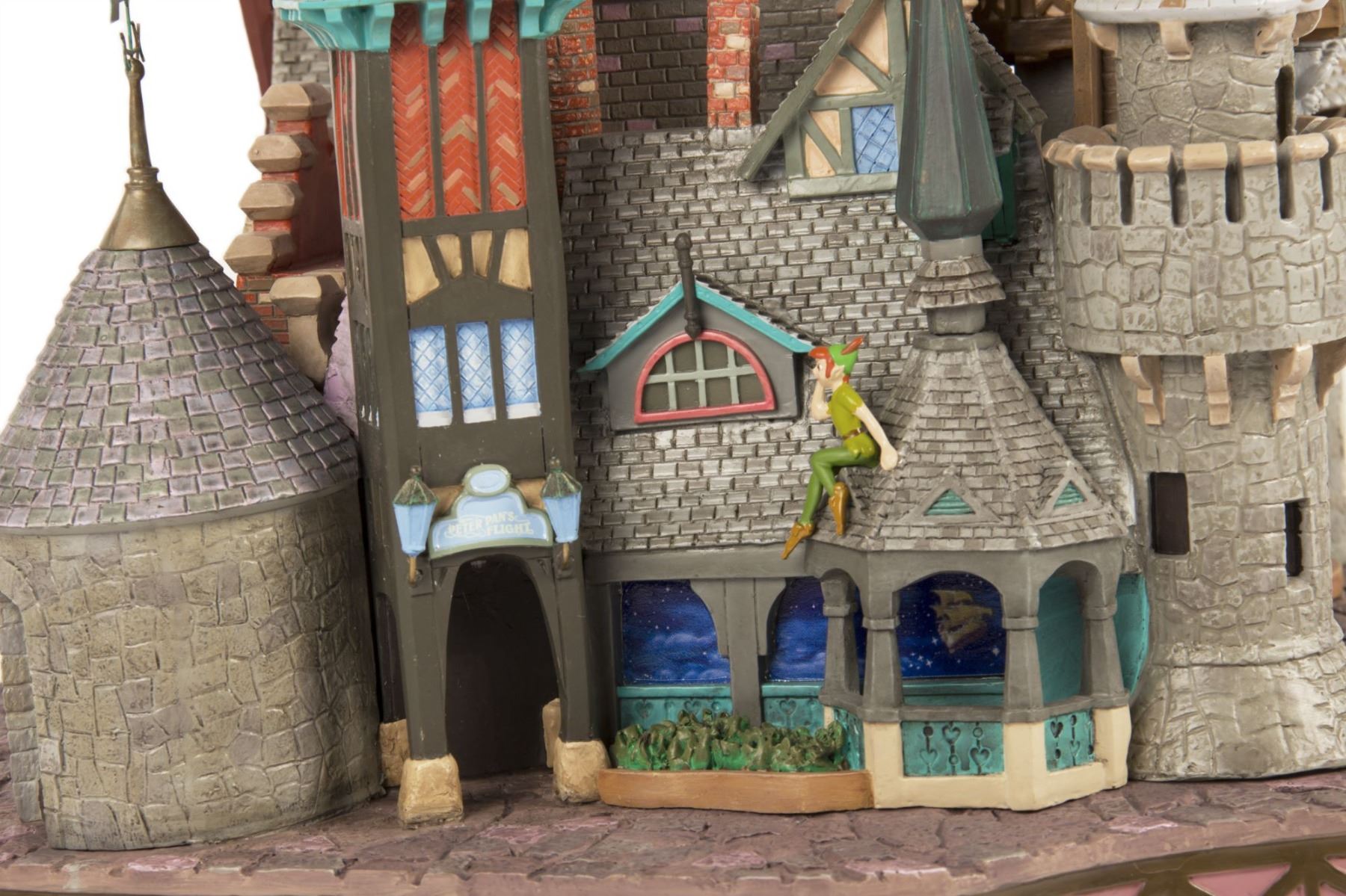 (Disneyland, 2005) A stunning "Magical Big Figurine" created by Larry Nikolai for the 50th anniversary of Disneyland. This Fantasyland themed "Big Fig" features attractions such as Snow White's Scary Adventures, Mr. Toad's Wild Ride, and Peter Pan's Flight. This "Big Fig" is battery-operated, with lights throughout that cause mural elements and windows to glow. This figurine measures approximately 15" in diameter and 16" tall, and is in very good condition with minor wear throughout from previous display including a few light bends to some of the spires.
