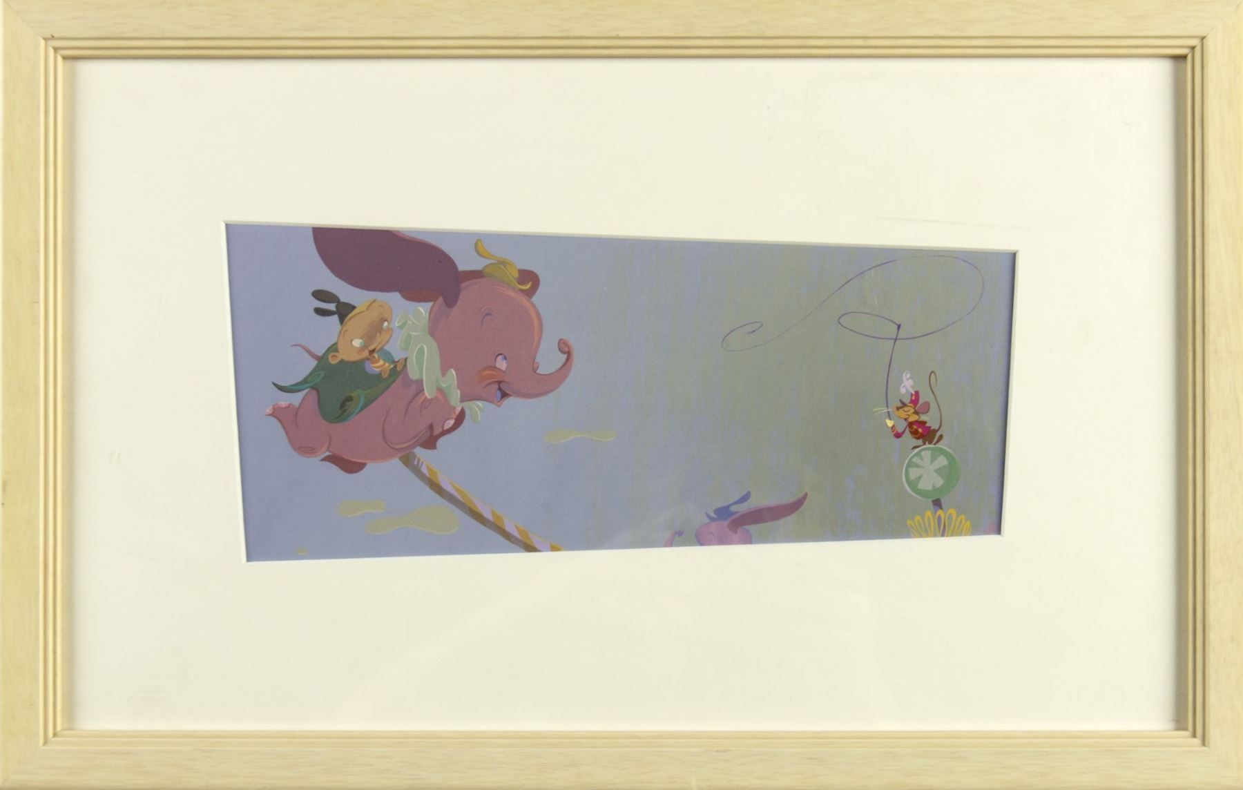 (Disneyland, 2010) An original painting by Jody Daily featuring the "Dumbo the Flying Elephant" attraction. This painting, accomplished in acrylic on artist's board, was displayed at the "Disney Gallery" on Main Street and comes in its original frame. The artwork measures 13"x20" framed, and is in very fine condition with some scuffing to the frame.