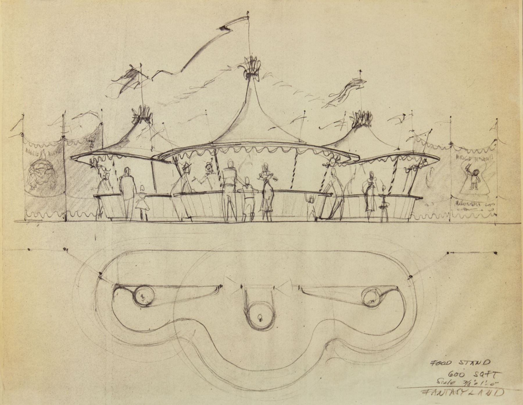 (Disneyland, c.1954) A concept brownline by Imagineer Bruce Bushman featuring illustrations for a "Food Stand" in Fantasyland. This brownline measures approximately 19"x24" and is in good condition with some minor edge-wear and a thin strip of tape along the top-edge of the back side.