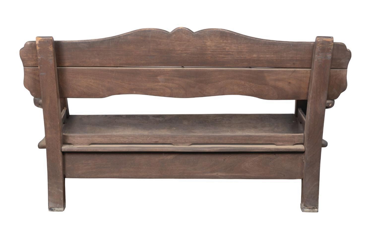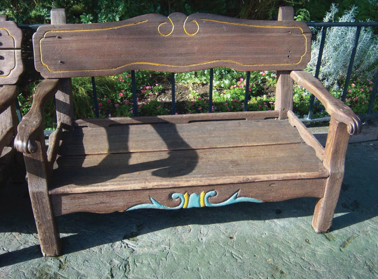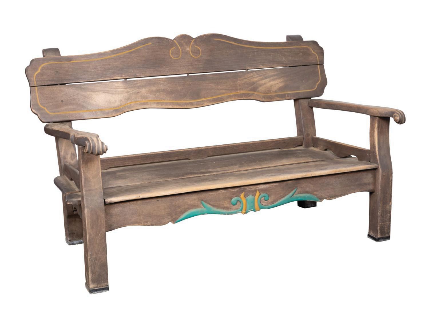 (Disneyland, 2000s) An original hand-painted wooden bench from Fantasyland at Disneyland. This whimsical wooden bench with scroll armrests and wide seat was placed along Matterhorn Road in Fantasyland to allow guests a chance to enjoy the scenic view on their way to the thrilling steel roller coaster attraction. Measuring 56" long, 33.75" tall, and 32" in depth, the hard wooden Fantasyland bench is in very good condition, with scuffs and scratches throughout from use. This item may require special shipping arrangements, please inquire for details and estimates.