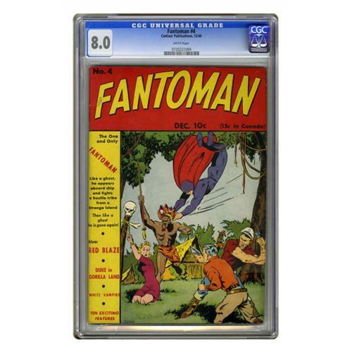 <B>Fantoman #4 (Centaur, 1940) CGC VF 8.0 White pages.</B></I> Gerber's <B>Photo-Journal</B></I> gives this issue its "7" (scarce) rating -- typical for Centaur comics, which are hard to find at best! Louis Glanzman drew the book's cover, and Paul Gustavson is among the interior artists. This was the last issue of the title. Overstreet 2005 VF 8.0 value = $600. CGC census 12/05: 2 in 8.0, none higher.