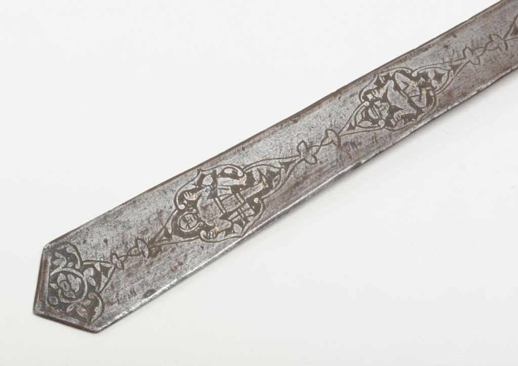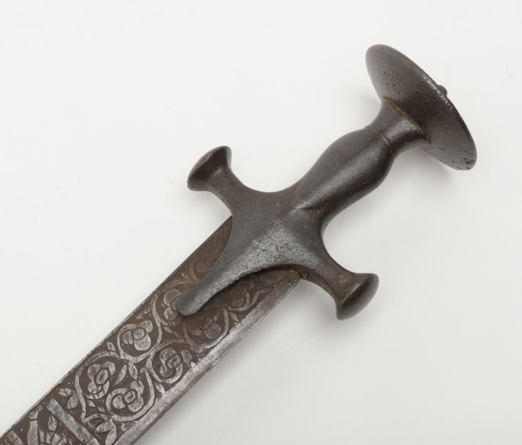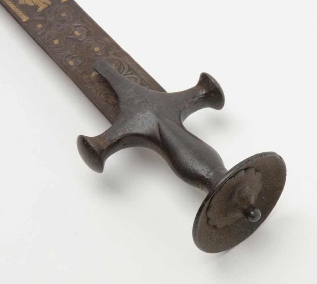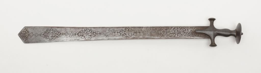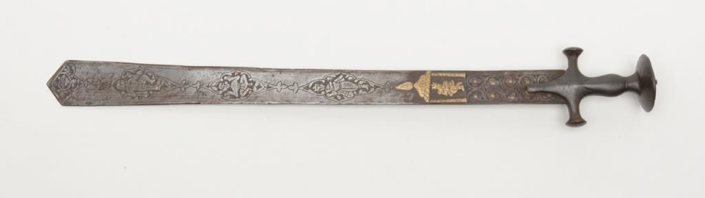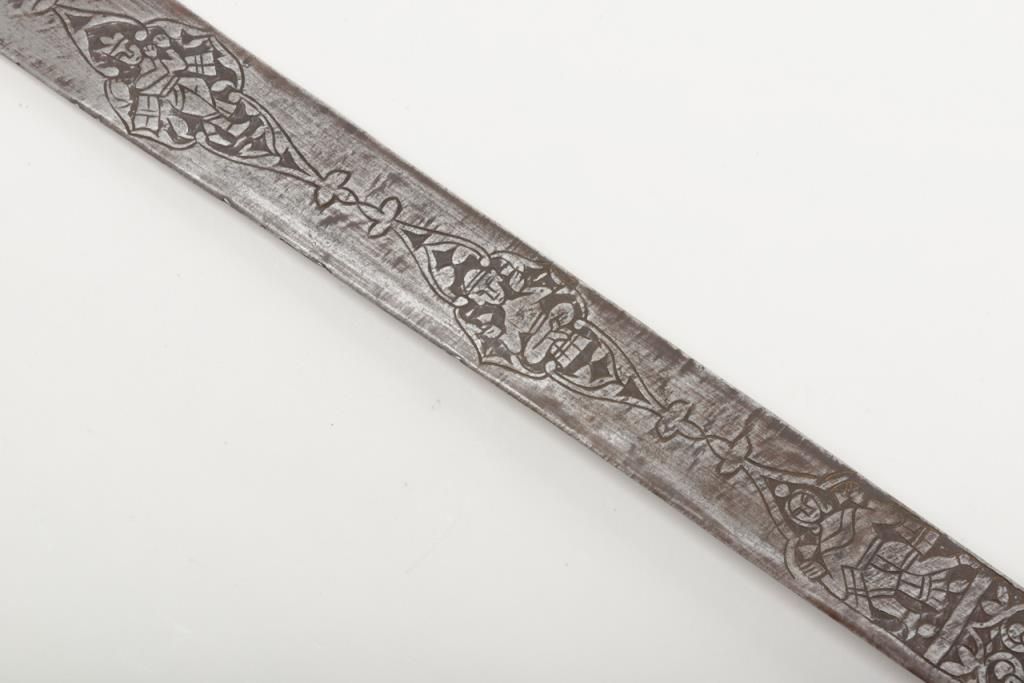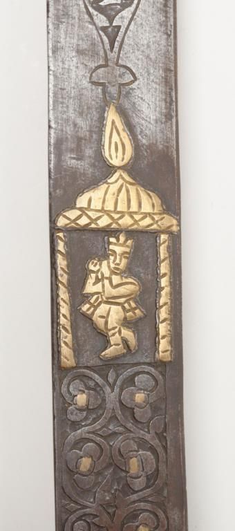 Far East Indian sword (no scabbard), approx. 31-1/2” overall with a 27” blade that is 1-3/4” wide at the hilt and gaining in width to 2-1/2” at point; etched with royal personage scenes and on one side there are gold highlights toward thehilt; the grip and cross guard are one piece cast; overall very good un-cleaned condition. Est.: $400-$800