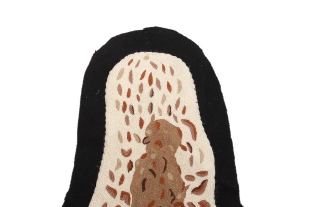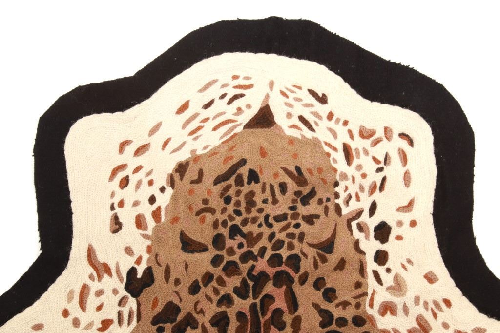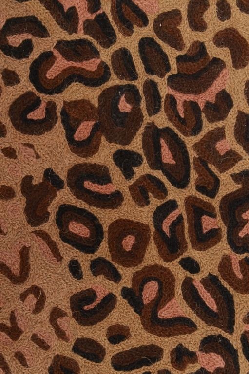 Offered in this lot is a handmade wool Leopard "skin" rug. The rug is made by knitted wool, embroidered into a Leopard "skin”, and then stitched onto black wool felt. These rugs come from Nepal and India. The rug is 78" in length and 47" in width, and in very good condition.