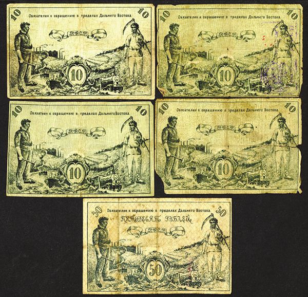 Russia, Lot of 5 notes, Includes 10 Rubles (3), P-S1181a without hand stamp and P-S1181b with hand stamp; highlighted by 50 Rubles, P-S1183a, without hand stamp, appears Fine to VF but there is a 1 inch internal tear to the left of the globe, still a very rare note.