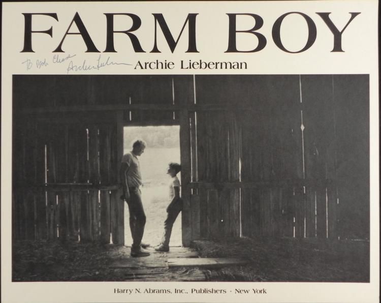 Artist: Archie LiebermanTitle: * Farm Boy - Man-to-man * Medium: Poster - * advertisementSignature: Signed by artist, upper * leftDedication: Bob * ChasePublisher: Harry N Abrams, Inc. Publisher - * New York * Image size: 16" x * 20"Condition: * ExcellentBiography * Archie * Lieberman (1926-2008) was born and raised in Chicago and * attended the Chicago Institute of Design and the Art Institute of * Chicago. During World War II he served as Marine combat photographer in * the Pacific. He was a photojournalist for magazines, including Time, * Life, Fortune, Paris-Match, Collier's, Holiday, London Illustrated and, * from 1952 to 1972, for Look Magazine. He also fulfilled assignments for * advertising agencies and corporations, including Lands' End, which * sponsored the exhibit of his work at Knox. * Lieberman * wrote or * photographed more than 20 books, including "Mummies of Guanajuato," a * collaboration with famed author Ray Bradbury. In "Neighbors," Lieberman * documented the everyday lives of the people of Jo Daviess County in * northwestern Illinois, where he lived for the past 25 years. "Farm Boy," * a rare collection of photographs that follows one family that lived * near Lieberman, has long been on display in the Knox College President's * conference room in Old Main. Lieberman's work also is memorialized at * the website * *Retrieved from: * http://www.knox.edu/news-and-events/news-archive/lieberman-obituary.html *