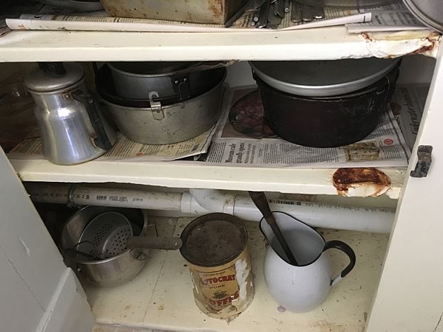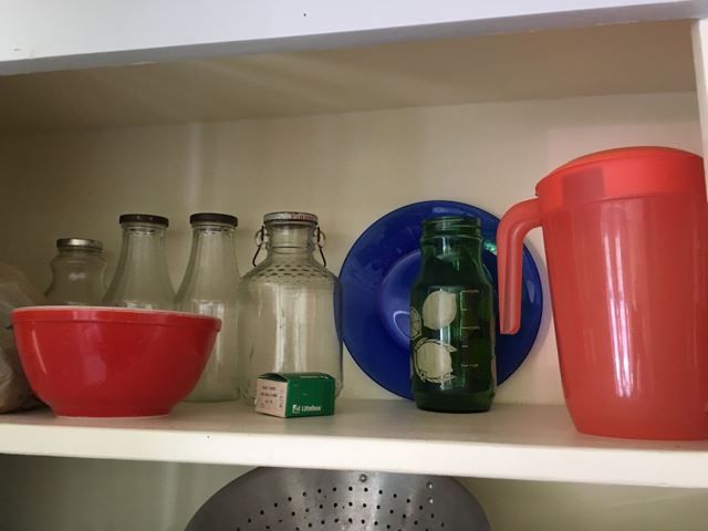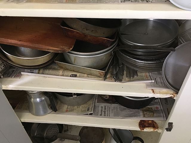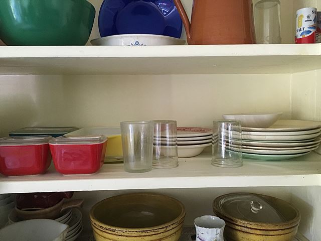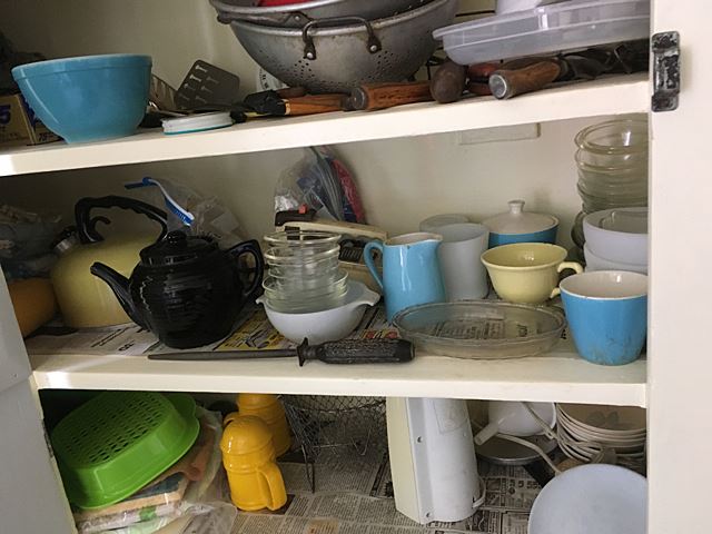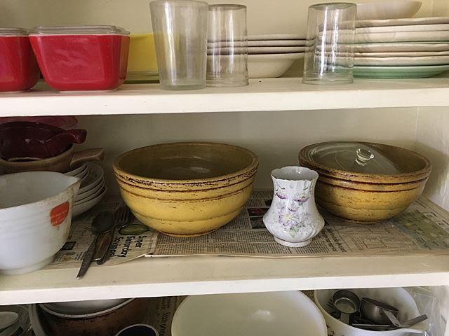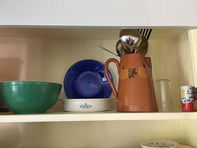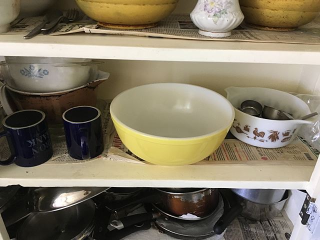 Farm House Kitchen Cabinet Contents. Being sold as found at the estate, large assortment of kitchen goodies just as you would expect to find in grandma's kitchen. This lot includes pitchers, vintage mixing bowls, Corningware, pots and pans, plates, jars, tea pots, salt and pepper shakers, coffee cups, utensils, all being sold for 1 monies! This lot is from a 100 year old Farm House in Sharon, CT, at the estate of Mr. John Morgan, a prominate Connecticut farmer, whose family has owned and farmed at this location for over 50 years. This lot can be picked up in Sharon CT for local buyers, or our shipper can pick up and ship to your location.