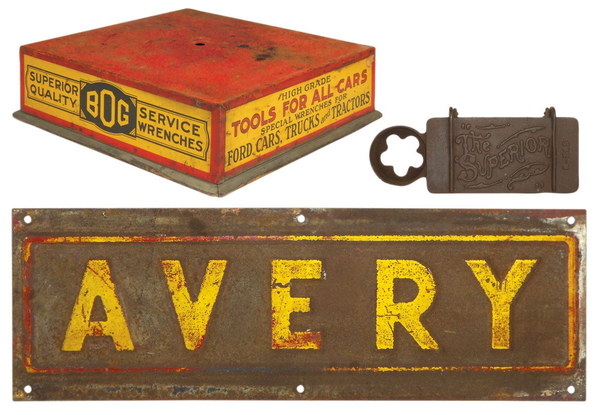 Farm implement & tool accessories (3), partial Bog High Grade Tool Box, Bog Mfg Co.-Chicago, metal w/graphics on 3 sides, VG cond, 5"H x 15"W x 15"D; Superior Implement Tool Box, cast iron, VG cond, 3"H x 13"W x 6"D & Avery sign, embossed self-framed metal, Good cond, 12"H x 36"W.