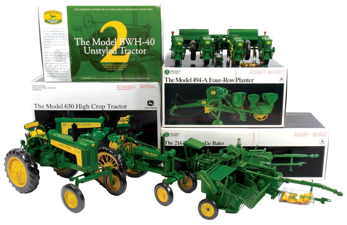Farm toys (4), Ertl Precision Classics 214-T baler, Ertl JD Model 494-A 4-row planter, JD 630 High Crop tractor, Ertl JD Model BWH-40 tractor, all in Exc cond.