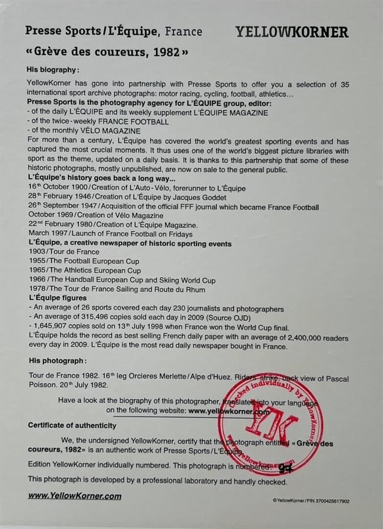 Presse Sport L equipe France Greve Des Coureurs 1982 YellowKorner Certified Photograph. Certificate of Authenticity from YellowKorner affixed to the back. Matted Dimensions 16"x20". Protected with Clear Mylar Sleeve.