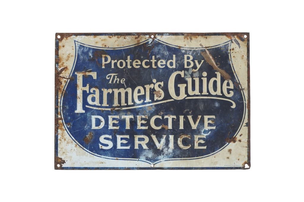 For your consideration is this 1940s metal sign reading, "Protected by The Farmer's Guide Detective Service". This sign would have been posted on a house or business to deter thieves from stealing from them. The sign shows a blue shield shape with white lettering reading, "Protected by The Farmer's Guide Detective Service". The bottom right reads, "Made in U.S.A. American Ca..." in small blue lettering. The sign shows consistent wear from its vintage age with missing paint and rusting present. There are six punched holes from when it was mounted. The sign measures 6 7/8" L x 9 3/4" W.