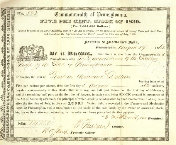1862, Pennsylvania. $14,000 bond bearing 5% interest. Black. Cut cancelled across center. Very fine.