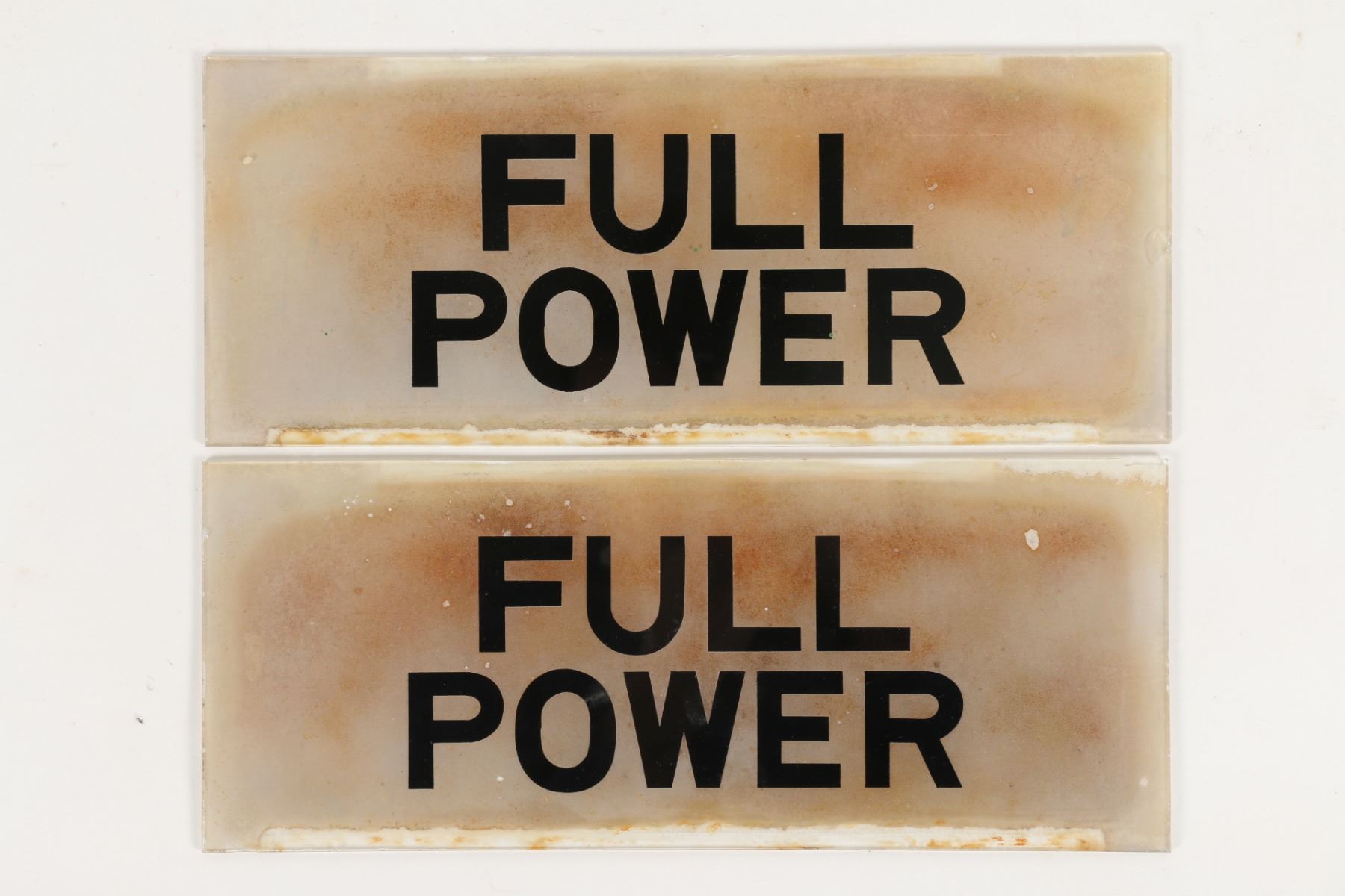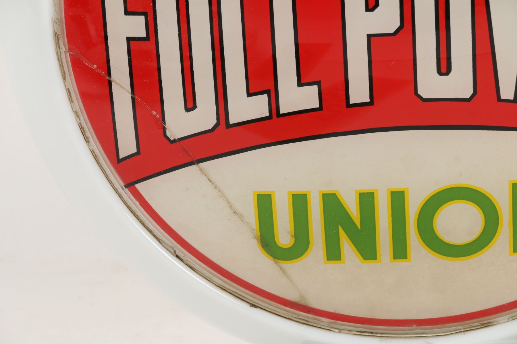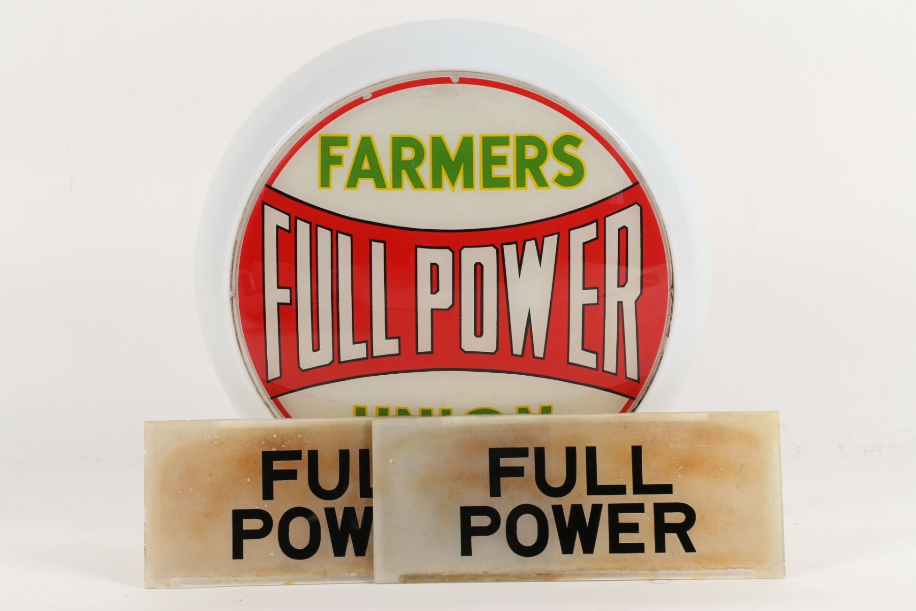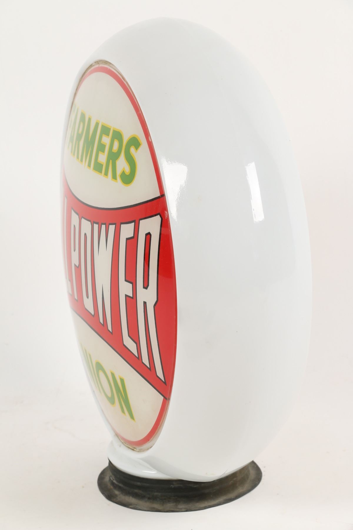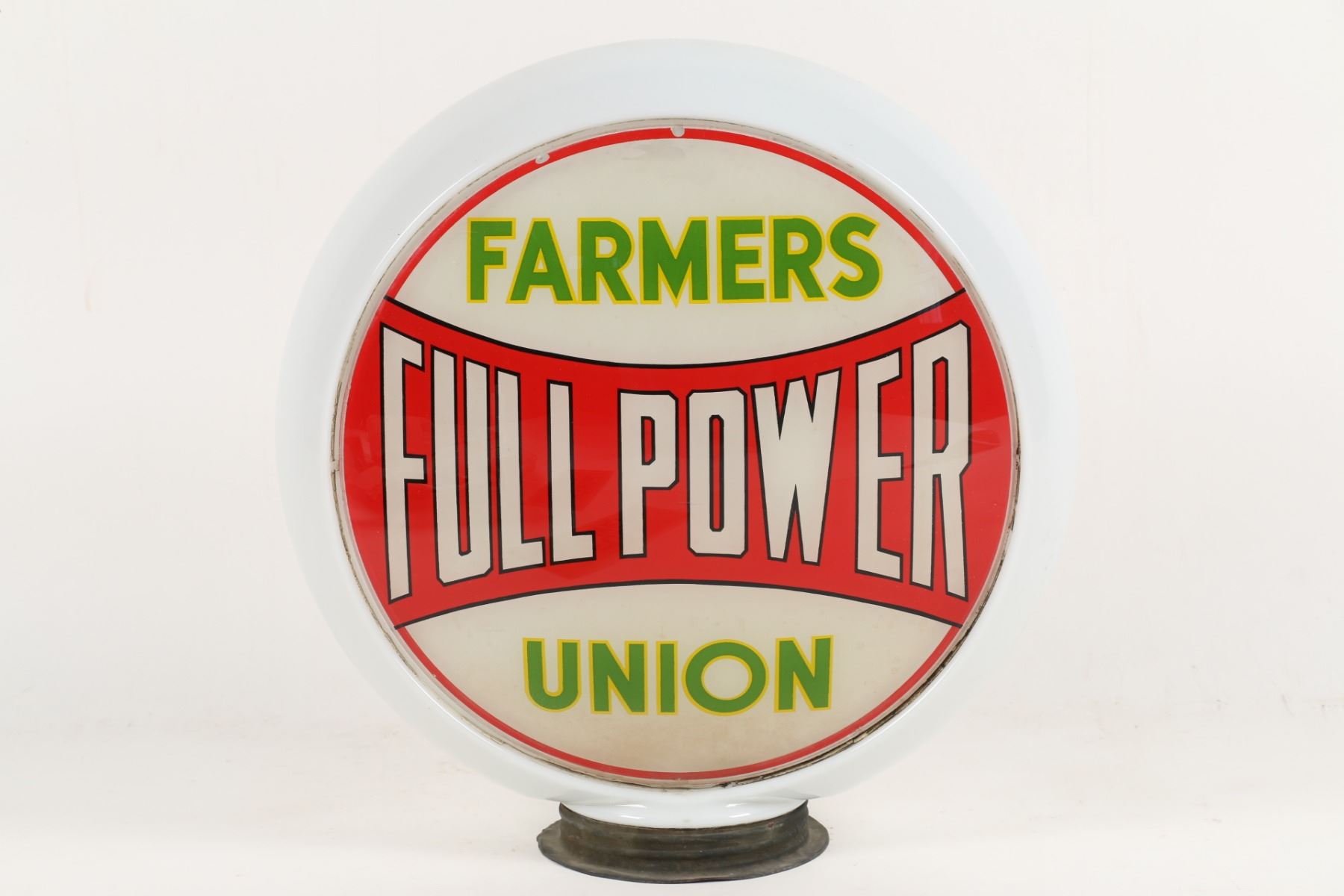 Milk glass globe with two reverse-painted lenses. Includes two matching ad glass panels. 13" lenses. Panels 12.25" x 5" each. One lens is cracked. Ad glass panels are worn and discoloured. Scattered edge chips. The lenses are silicone into place. $200-300.