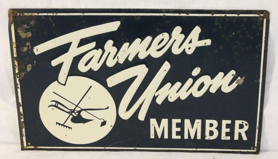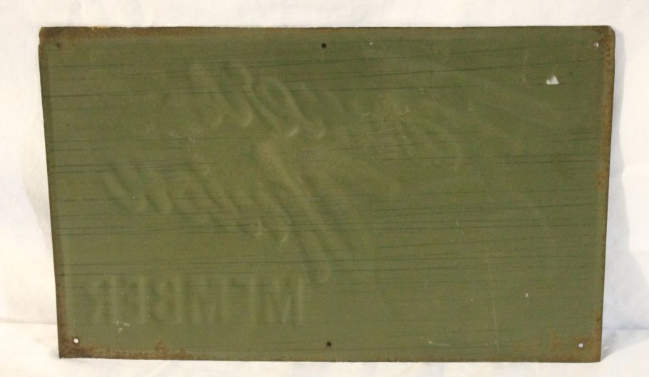 Has walking plow, rake, and hoe decals. Tin, embossed. 16" x 10"