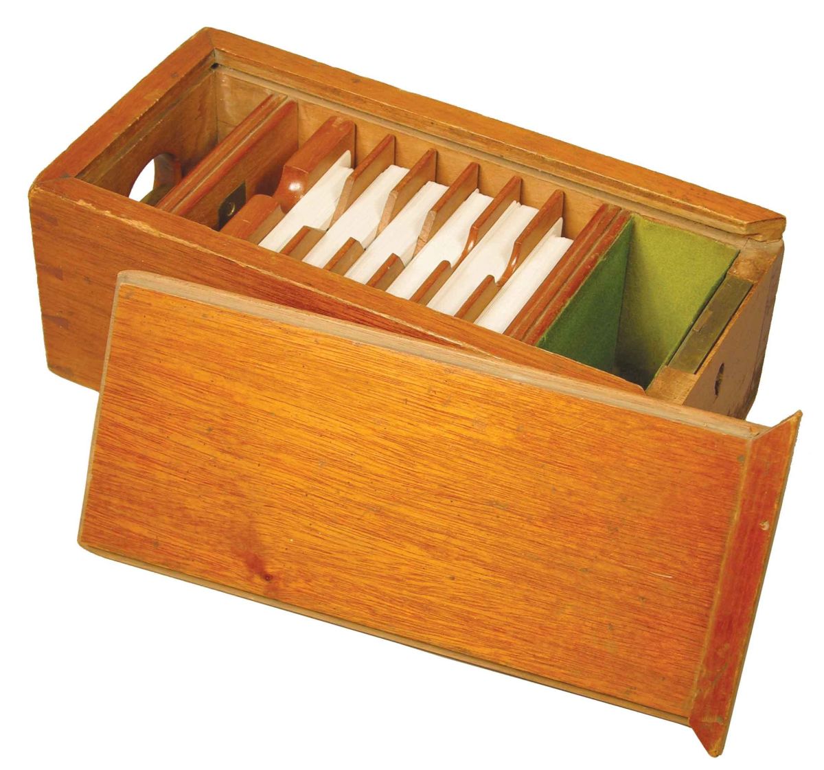Faro Card Press by Mason & Co. with space for a dealing box inside. Walnut press and sliding top in excellent condition, dealing box shows normal wear