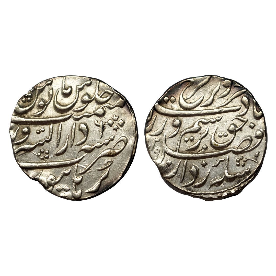 Farrukhsiyar, Rupee, Burhanpur Dar us Sarur Mint, complete Mint name in the bottom and mint epithet in the central line on rev, AH 1129, RY 6. No Test Marks, Extremely Fine+, Scarce in this high grade.