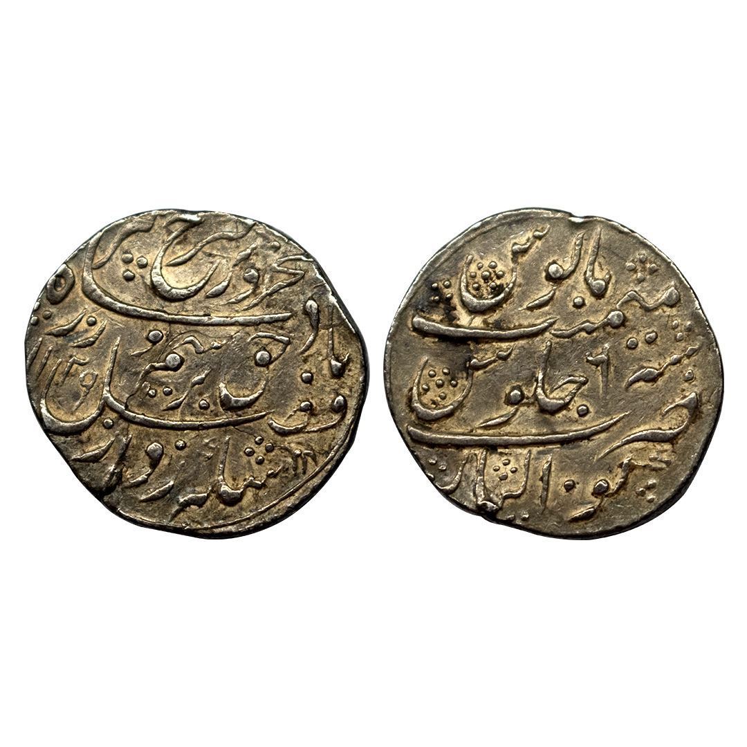Farrukhsiyar, Rupee, Gwalior, complete Mint epithet name in the bottom line on rev, AH 1129, RY 6. About Extremely Fine+.