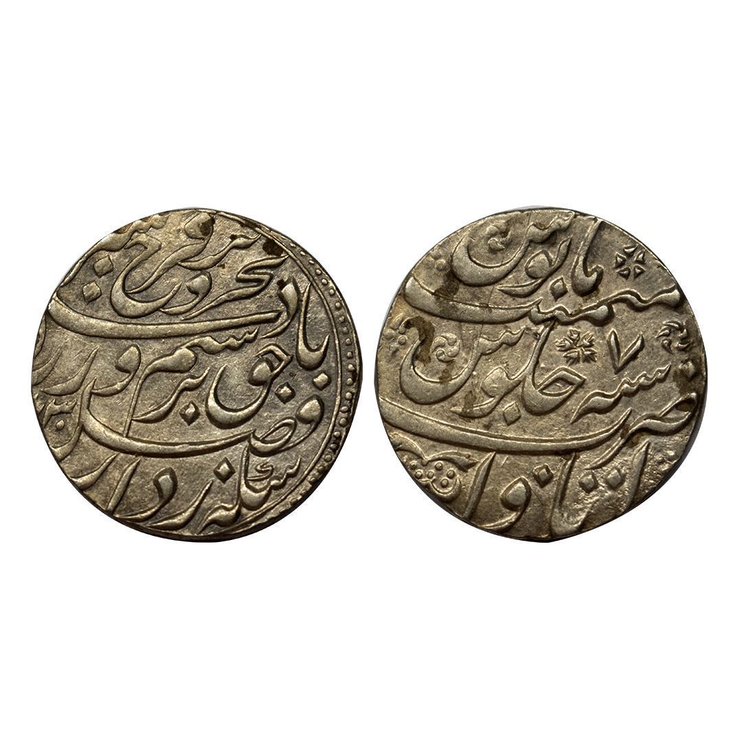 Farrukhsiyar, Rupee, Itawa Mint, complete Mint name in the bottom line on rev, AH 1130, RY 7. Broad flan, No Test Marks, Extremely Fine+.