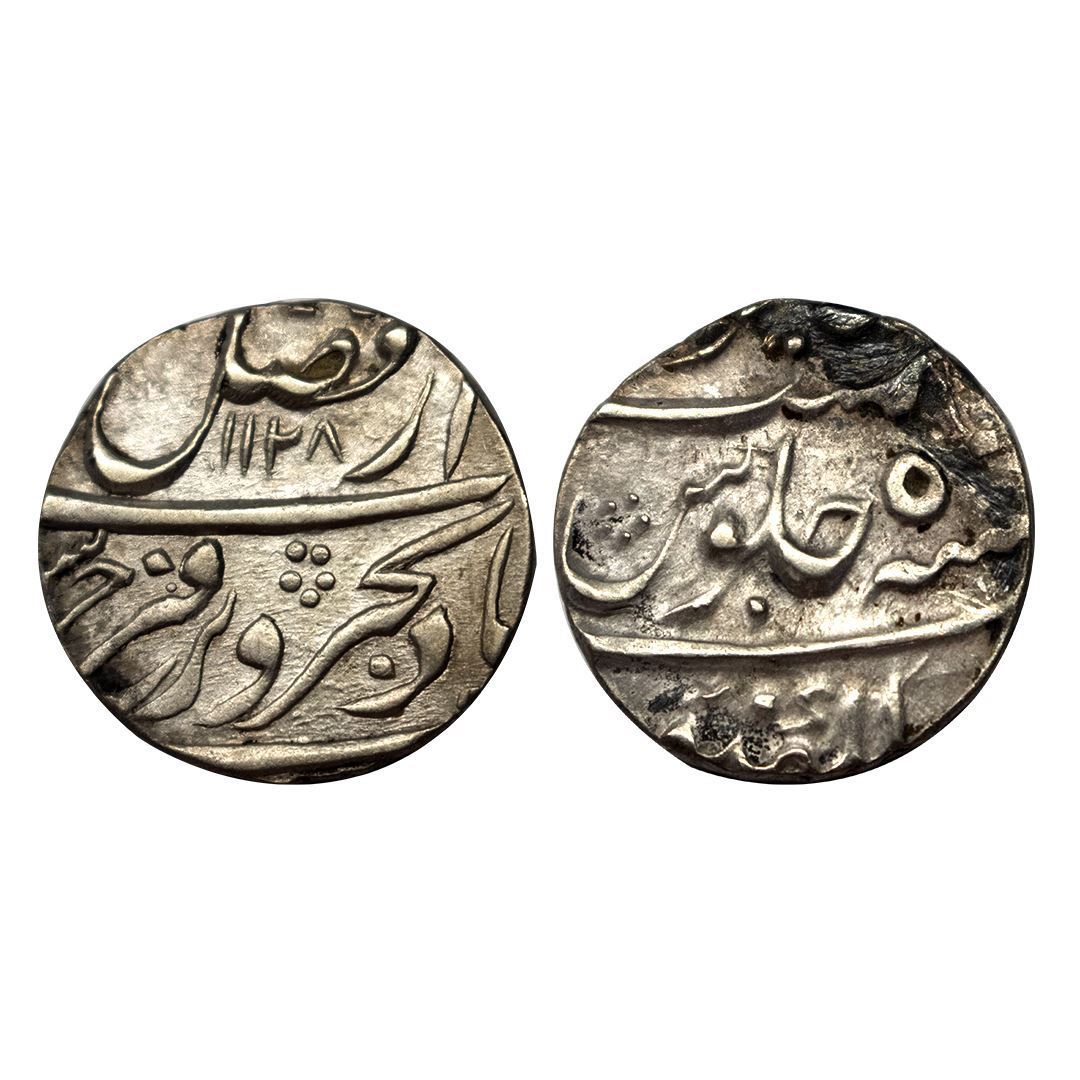 Farrukhsiyar, Rupee, Lucknow Mint, Mint name in the bottom line on rev, AH 1128, RY 5.