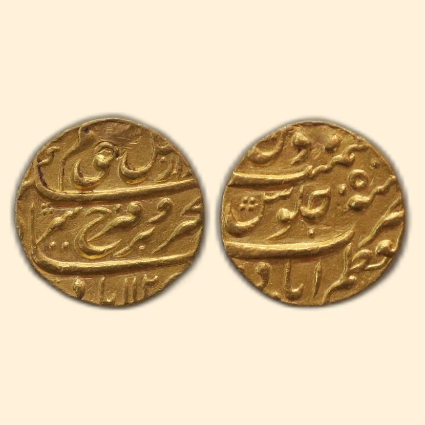 Mughals, Farrukhsiyar (AH 1124-1131 / 1713-1719 AD), Gold Mohur, 10.73gms, Muazzamabad Mint, AH 112X, RY 5, complete mint name on rev bottom area. (KM # 390.22).