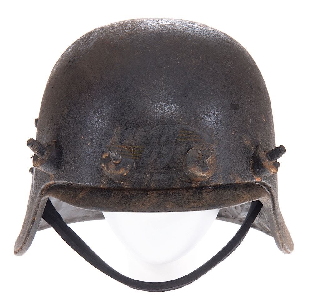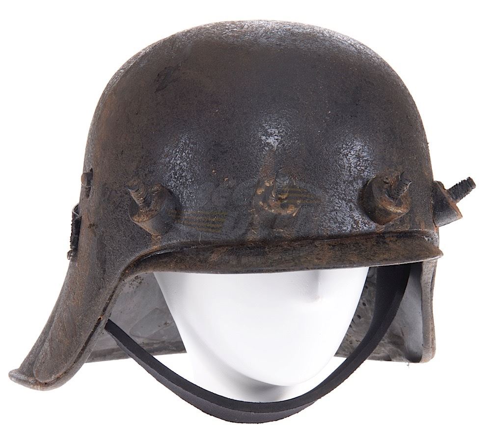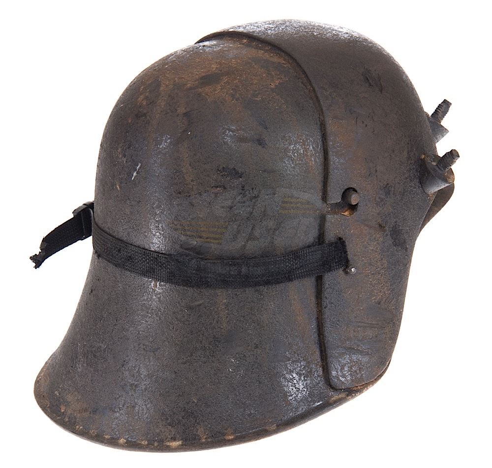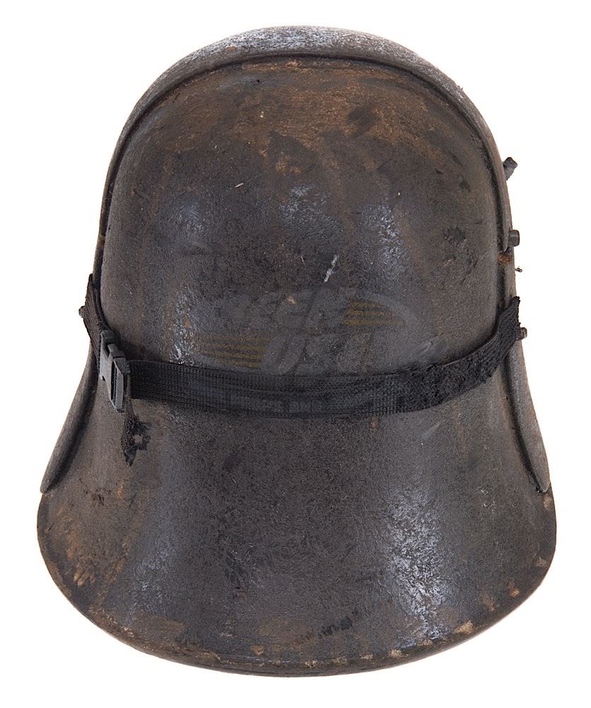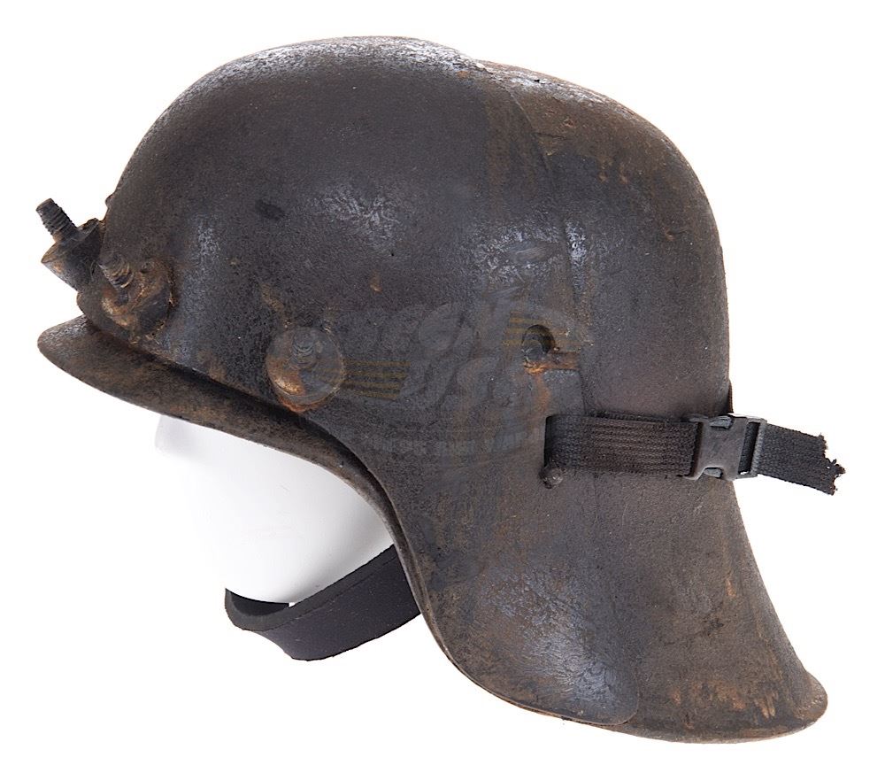 (Sci-Fi Channel,1999-2003) This alien helmet was custom-made by the production for use by various actors during the run of the series. The helmet is made of resin with applied plastic bolts and elastic strap detailing. Custom finishing and distressing give the helmet the battle worn appearance needed for filming. Minor wear from use is present.