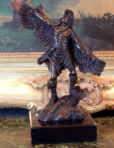 Native American Winged Warrior Bronze Sculpture, After PJ Mene, 11"H x 6 "W x 4"D 10 lbs. This bronze sculpture was produced using the "Lost Wax" casting method. The"Lost Wax" Cast method is the most precise metal casting technique in existence, ensuring exquisite detail of the original host model which is usually sculpted in clay or wax. This "Lost Wax" casting method is an extremely labor intensive and expensive process, but the end results produce a Heirloom Quality Masterpiece!Pierre Jules Mêne, (1810 -1879), was a French Sculptor and animalière. He is considered the pioneer of animal sculpture in the nineteenth-century.Mêne produced a number of animal sculptures, mainly of domestic animals including horses, cows and bulls, sheep and goats which were in vogue during the Second Empire. He was one of a school of French animalières which also included Rosa Bonheur, Pierre Louis Rouillard, Antoine-Louis Barye, Auguste Caïn, and François Pompon.His work was first shown in London by Ernest Gambart in 1849. Mêne specialized in small bronze figures which explains why none of his works exist as public statuary. His work was a popular success with the bourgeois class and many editions of each sculpture were made, often to decorate an increasing number of private homes of the period. The quality of these works is high, comparable to Barye's. Mêne also seems to have enjoyed a longer period of success and celebrity than his contemporaries. He is considered to have been the lost-wax casting expert of his time, later surpassed only by Auguste Rodin.