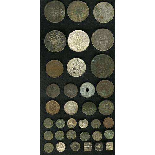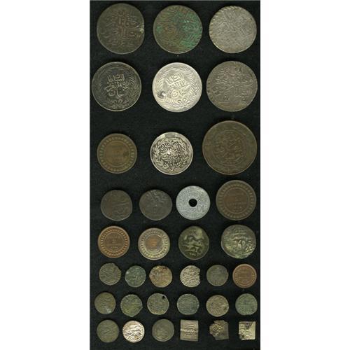 <B>Fascinating Collection of Early Types, </B></I>this group features everything from the earliest Ottoman issues to coins of the French Protectorate and was assembled by a local doctor in Tunis. The selection begins with three examples of the square silver Nasri of Ahmed III, two clearly dated 1118AH (1706AD), seventeen copper and billon issues dating from 1160AH - 1255AH, many scarce, KM90 Piastre, four dates, 1246H, 1247H, 1250H and 1254H, KM159 8 Kharubs 1281H, KM165 2 Piastres silver 1290H with the star counterstamp surcharge, KM167 4 Piastres silver 1290H, cleaned XF, bubble in the flan, very scarce, KM168 4 Piastres silver 1293H with star counterstamp, dark VF, needs cleaning, and French Protectorate types: Centime 1891A, UNC, cleaned but quite scarce, 2 Centimes 1891, two pieces, both AU cleaned, 5 Centimes 1904 and 1914 and 10 Centimes Zinc 1942, UNC. A great starter collection. The grades range from VG to XF and some examples are damaged. We recommend careful viewing. Catalog/retail value is approximately $800. <B>Sold as is, no return lot.</B></I>