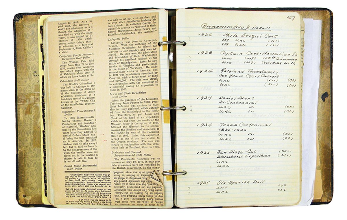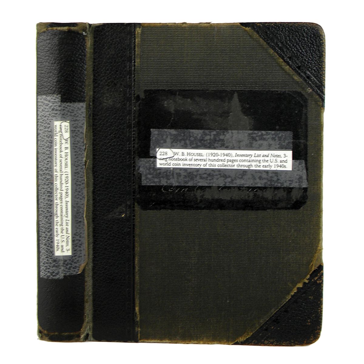 [Housel, Wm. B.]. HANDWRITTEN INVENTORY OF THE NUMISMATIC COLLECTION OF W.B. HOUSEL, ETC. (New Jersey, c. 1920s-40s). 144 ruled leaves, 8.5 by 5.5 inches, featuring handwritten entries in ink and pencil on one side, along with an index, clippings of numismatic articles, other sheets of notes, etc. Later handwritten analysis by Bob Vail of the half cents and large cents laid in. Housed in a black three-ring binder of the period, somewhat worn but intact. Contents generally fine. A highly interesting record of a wide-ranging collection, perhaps typical of that which could be formed by an enterprising collector of the day. The addresses of several dealers and collectors are recorded on the inside front cover and elsewhere, including J.G. Macallister and F.C.C. Boyd. Housel owned very nice collections of large cents and half cents, along with colonials, Civil War tokens, silver dollars, including a 1794 "ap. At 90.00 F.C. Boyd," half dollars, including 1796 and 1797s, commemorative halves, quarters and minor silver coins, proof sets 1858-1915 inclusive, historical medals, United States gold coins, paper money, "Bible coins," ancient Roman and European coins, etc. His library included a "1873 - 1st edition" Crosby, large cent titles, etc. Also present here is a detailed handwritten analysis by Bob Vail on several sheets of note paper, tracing the cent and half cent collections to Joseph H. Wright, a Trenton, New Jersey collector, who acquired them largely in the first quarter of the twentieth century; thence to Housel, who appears to have held them circa 1930-1950. [Online description truncated; see printed or PDF catalogue for full description.]