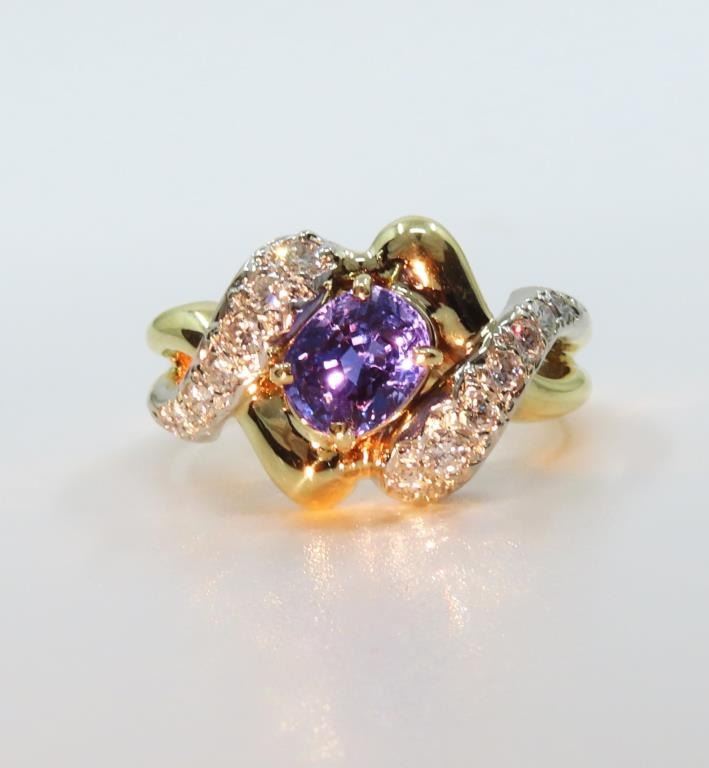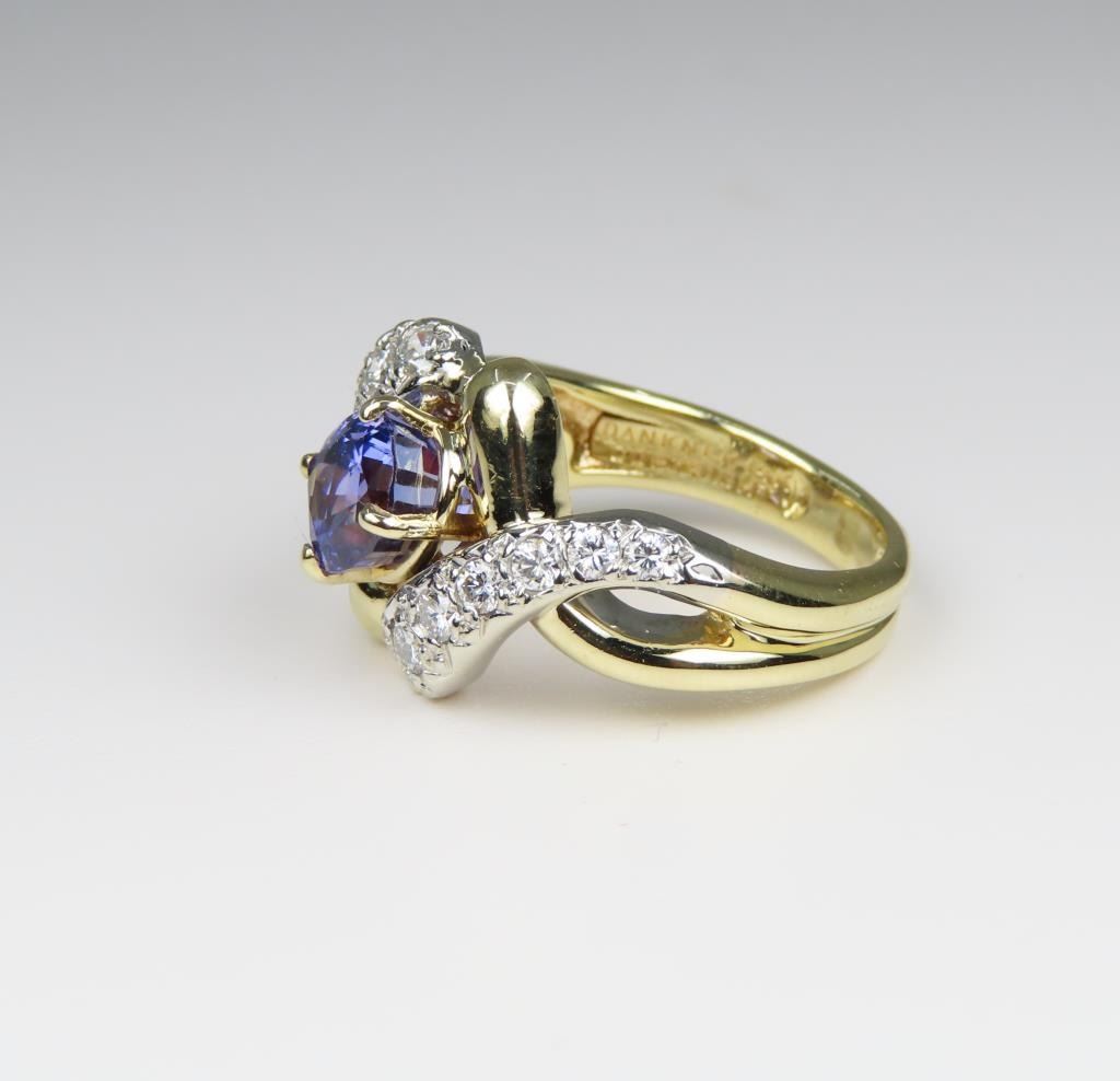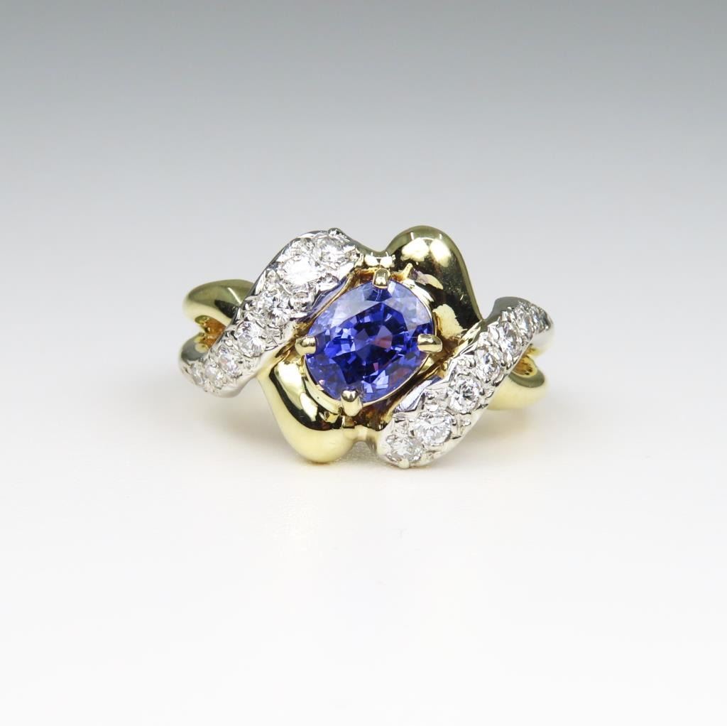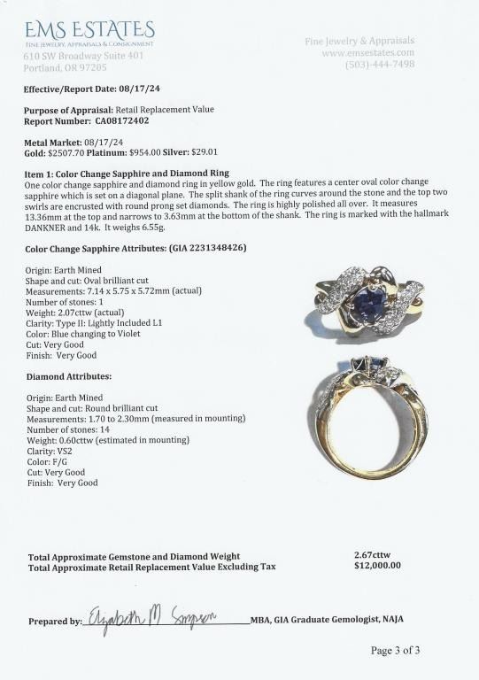 Sapphire and Diamond Ring featuring a Fine Quality G.I.A. Certified 2.07 carat Sri-Lanka Sapphire with color change from Blue to Violet accented with 14 round cut Diamonds with F-G colors and VS clarity set in a custom 14 karat yellow gold setting, with stamped ‘Dankner’ Hallmark, Size 6. Full Appraised Retail Value - $12,000.00