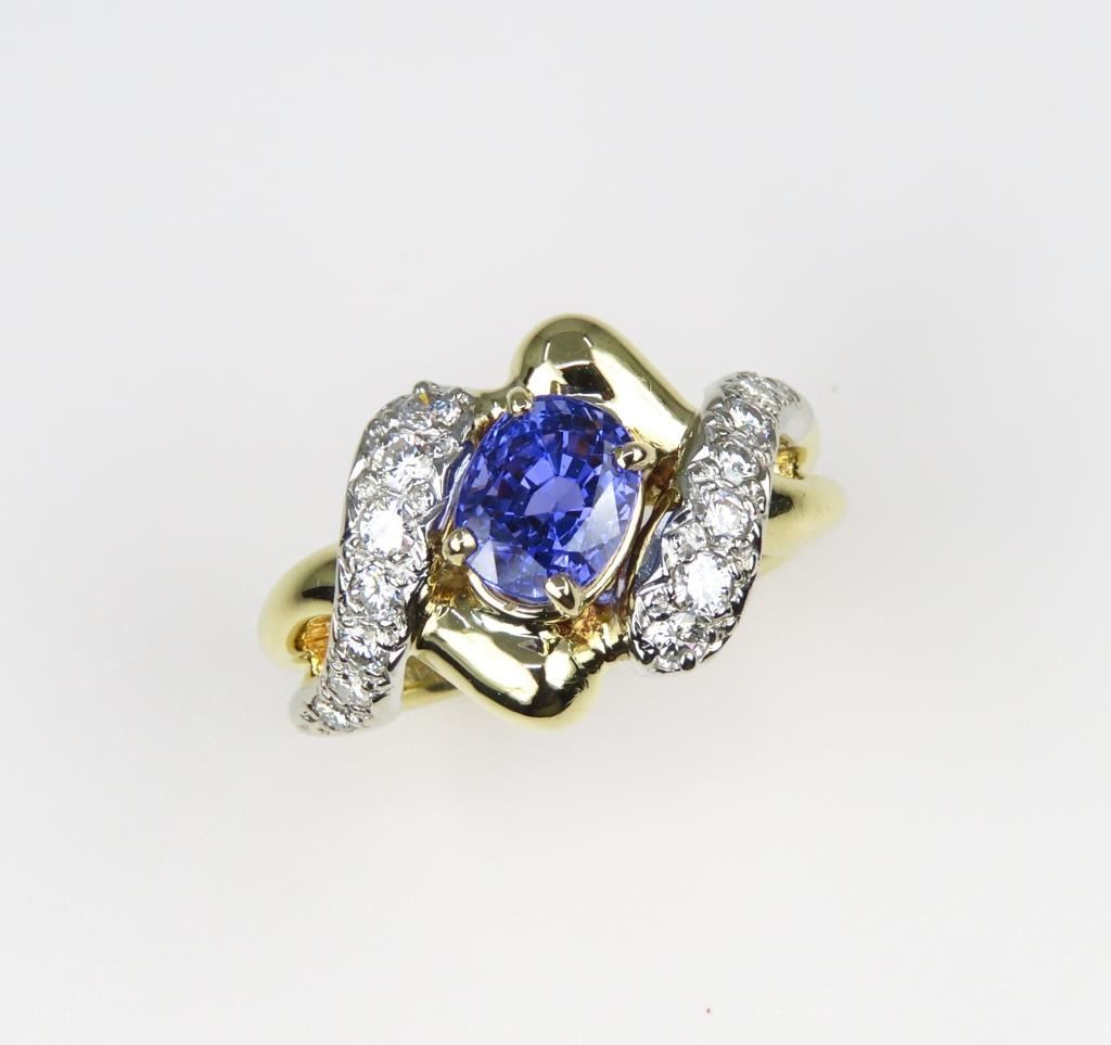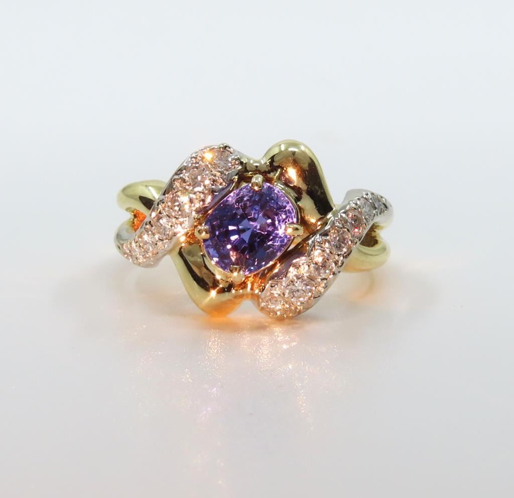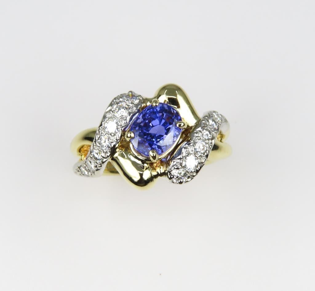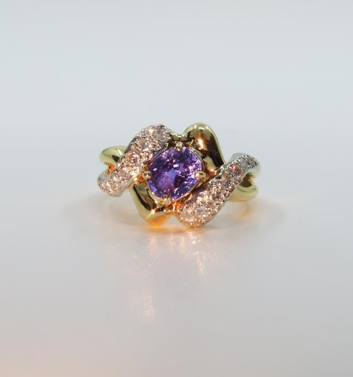 Sapphire and Diamond Ring featuring a Fine Quality G.I.A. Certified 2.07 carat Sri-Lanka Sapphire with color change from Blue to Violet accented with 14 round cut Diamonds with F-G colors and VS clarity set in a custom 14 karat yellow gold setting, with stamped ‘Dankner’ Hallmark, Size 6. Full Appraised Retail Value - $12,000.00