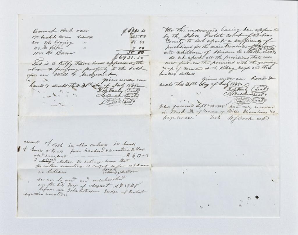 Fascinating double sided glass framed and matted Probate appraisal document in overall good condition, dated August 25, 1848, covering the estimated probate value of the estate of Hiram D. Miller including the value of corn crops, farm hogs, horses, cattle, furnishings, tools, and 12 slaves. Est.: $100-$200.
