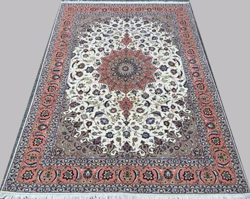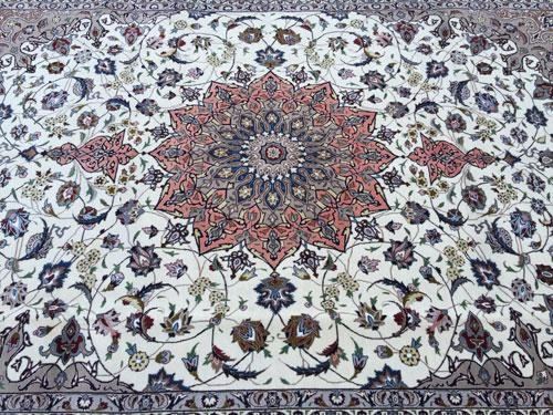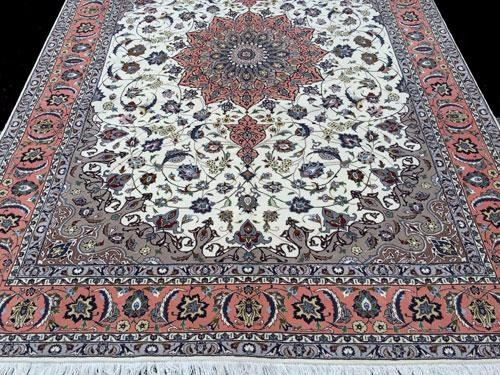 Fascinating and majestic fine part silk Persian Tabriz rug. 100%natural, vegetable dye, hand woven, pure silk and finest baby lamb's wool pile on cotton foundation. This is a strikingly majestic and artistic royal Tabriz, both in its design and quality. This is a perfect example of a sophisticated royal Tabriz design, with its tear drop sunburst central medallion and a captivating arabesque pattern on a soft beige background. This royal Tabriz has a lustrous appearance of utmost beauty with its glowing silk highlights giving it a three dimensional character. Please check the photos for amazing details and care put into creating this work of art. This lovely piece is masterfully hand woven, knot by knot, and has about 360 knots per square inch. It takes a master weaver well over four years to create this beauty. Where Persian rugs are typically limited to twelve and sixteen colors, this endearing piece features more than thirty eight different colors, creating a tapestry of colors that are feast for the eyes. The highest grade of silk and baby lamb's wool, spirited uncompromising workmanship, sublime color palette and durable construction have made Tabriz rug of choice for many centuries. The leather band sewn on the edge at the back of this rug is to keep the edges from curling under due to the extreme tightness of the weave. Creases in this rug are due to fold and not a defect. Size: 9 feet 9 inches X 6 feet 9 inches. Country of Origin: Iran.