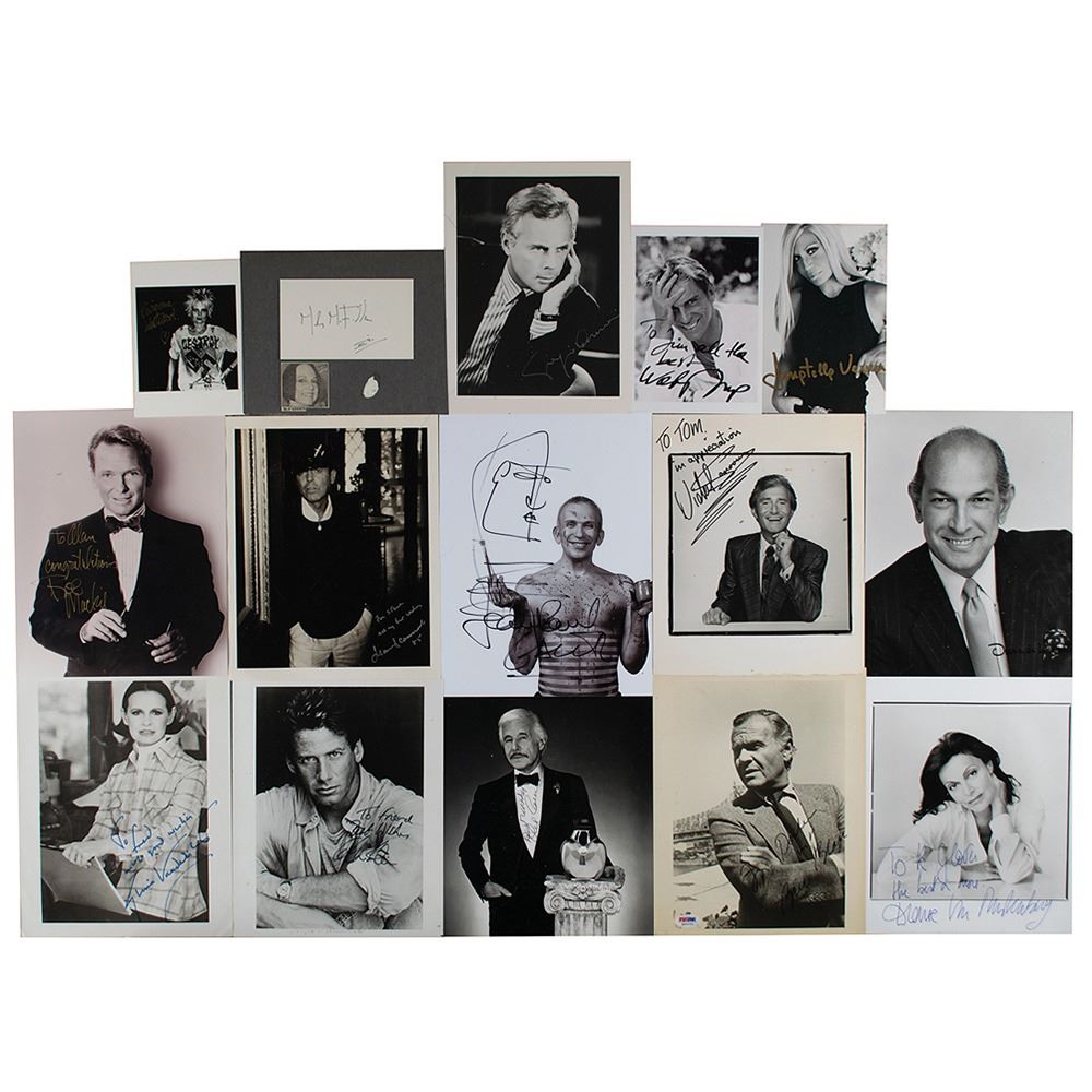 Collection of 15 items individually signed by a notable fashion designer, photographer, or stylist, consisting almost entirely of photographs that range in size from 4 x 5.75 to 8 x 10.5, with several inscribed. Subjects include: Giorgio Armani, Bill Blass, Oleg Cassini, Oscar De La Renta, Diane von Furstenberg, Jean Paul Gaultier, Wolfgang Joop, Calvin Klein, Bob Mackie, Mary McFadden (5 x 3 card), Vidal Sassoon, Francesco Scavullo, Gloria Vanderbilt, Donatella Versace, and Vivienne Westwood. In overall fine condition, with some light wear or creases.